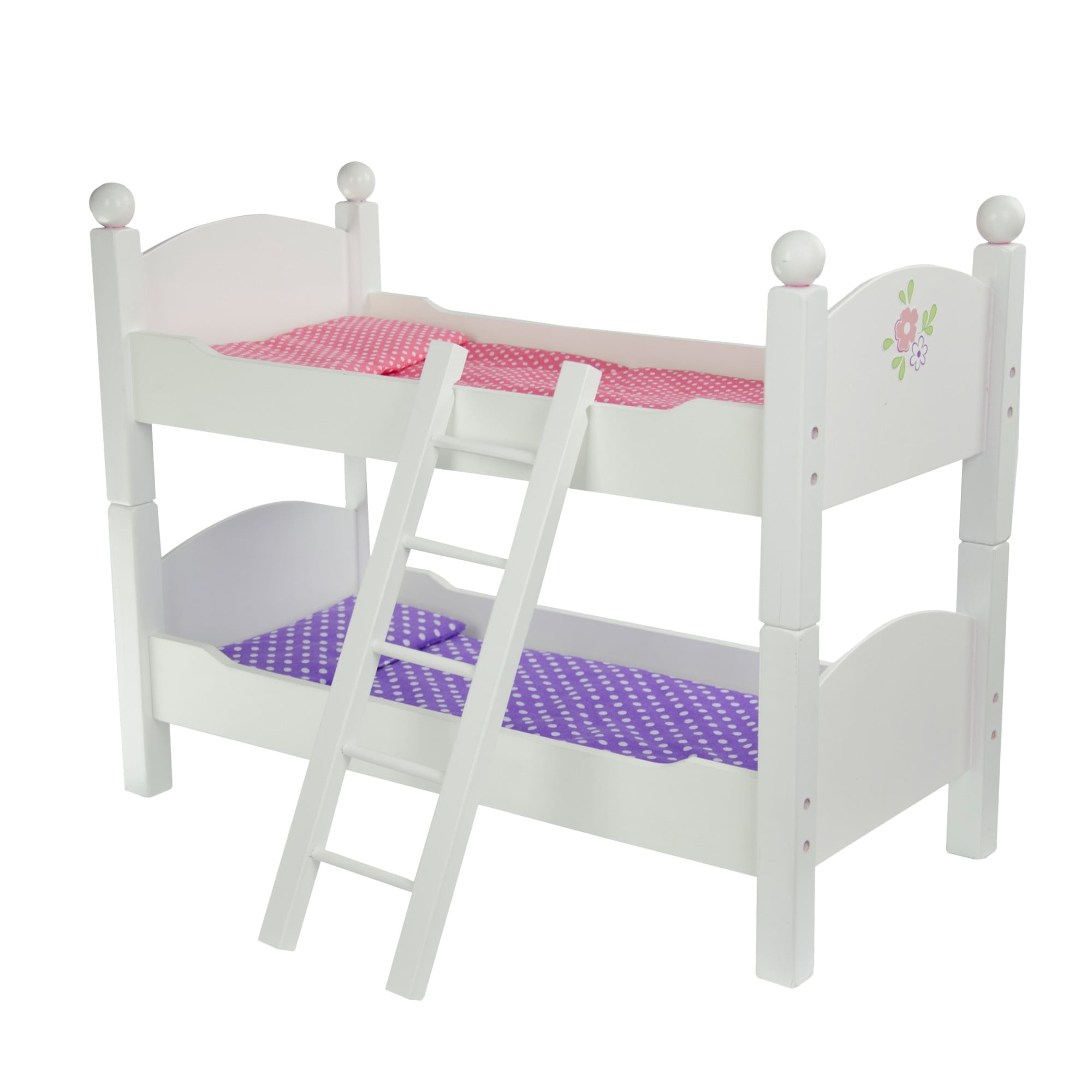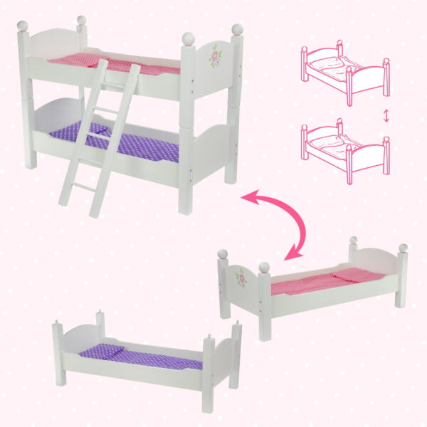 A convertible bunk bed for 18″ Dolls – stack as a bunk bed, or separate as a pair of single beds, includes a ladder in a white finish Realistic, almost miniature versions of real-life furnishings with rounded headboards, footboards, and rounded finials on the top bunk Includes a set of pink and a set of purple polka-dotted blankets and pillows High-quality construction, made of kid-safe engineered wood (MDP) to last a long time Dimensions: 20″ L x 10.63″ W x 17.13″ H (stacked)