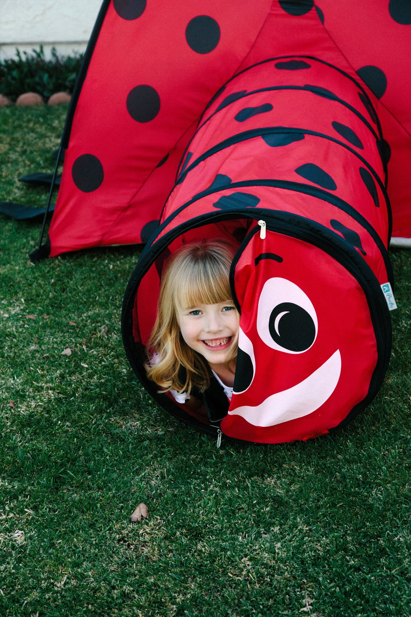 Its everyones favorite friendly insect! This 51 x 51 x 43 tent works just as perfectly outdoors as it does indoors so you can be amongst the rest of the ladybugs, and even has a washable floor when youre ready to bring it inside. It also comes with its own detachable 4 x 19 tunnel as well as its own carrying case for easy transport and storage! Its durable construction ensures years of play to come, and is even big enough for groups. Everyones buzzing! Ideal for child ages 2 -5 years girls or boys.