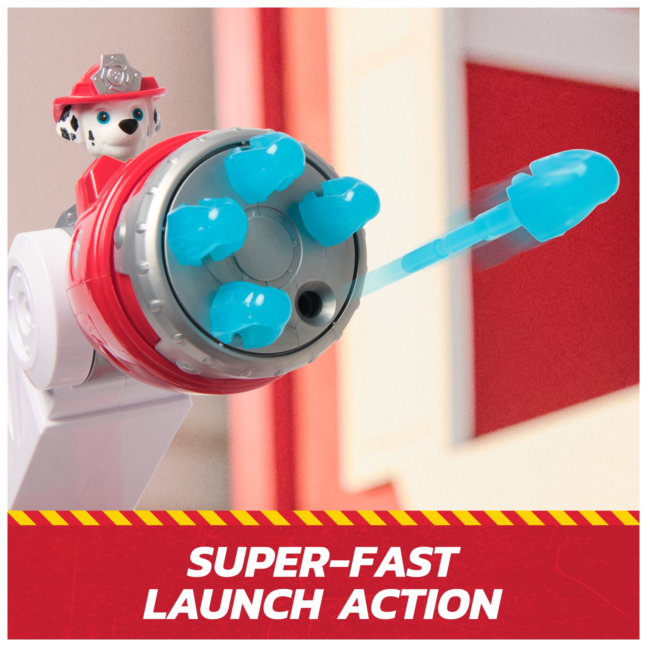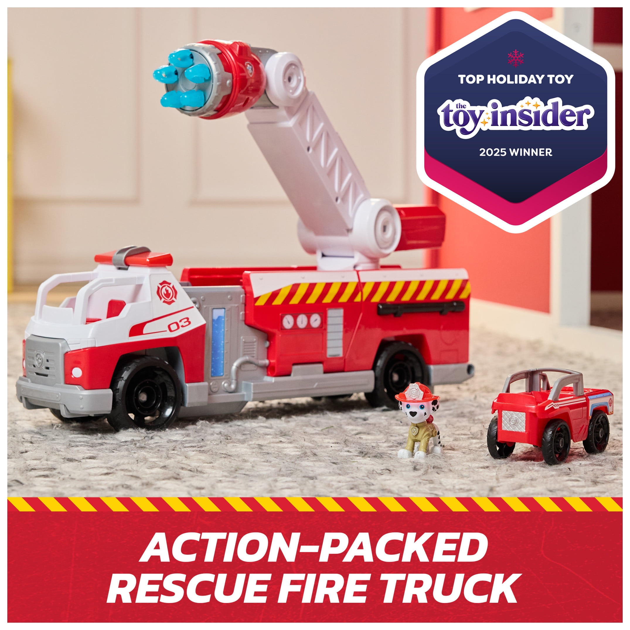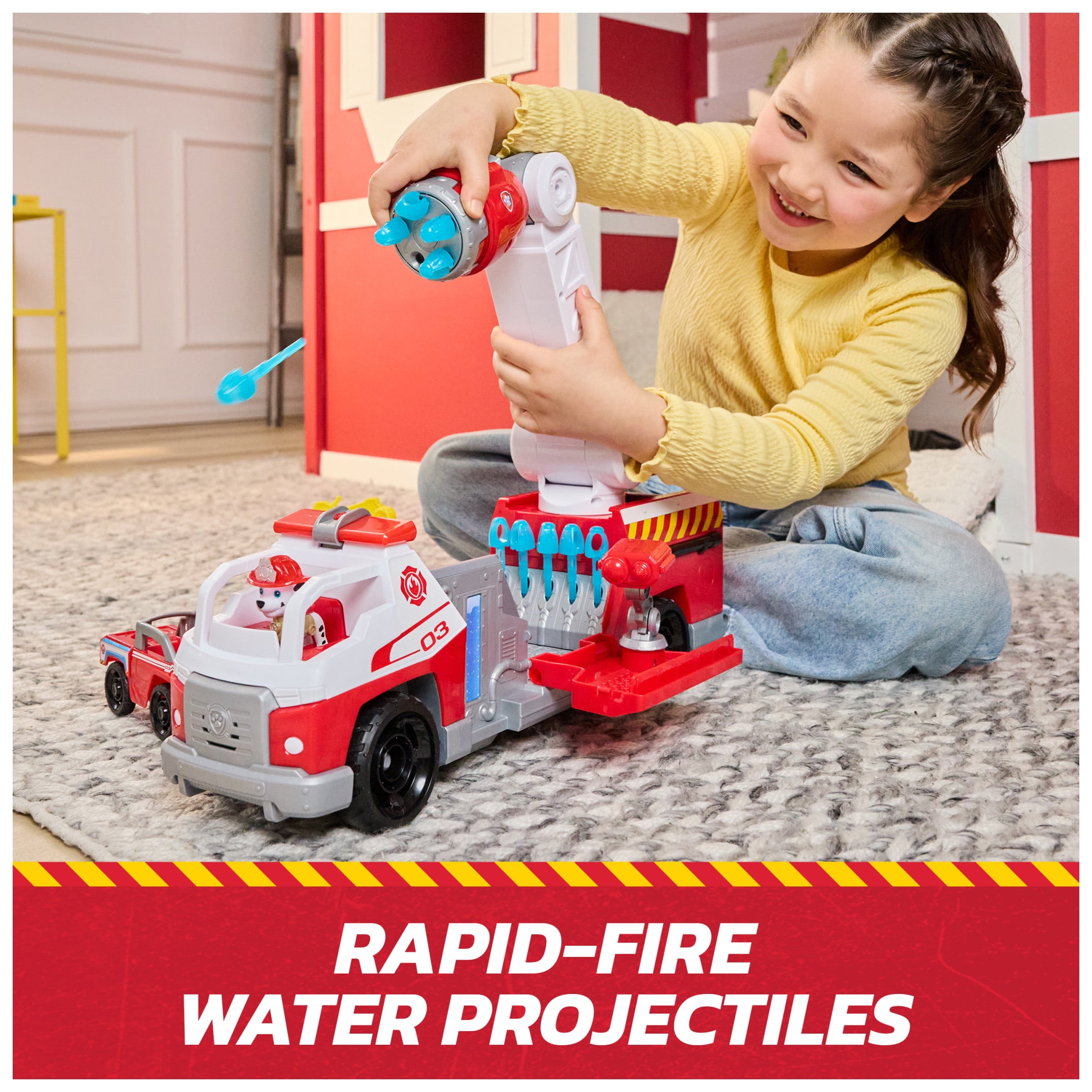 Get ready for thrilling adventures with PAW Patrol Fire Rescue Rapid Reload Fire Truck! This action-packed toy is a hero’s dream, featuring Marshall’s 20-inch long fire truck with lights, sound effects, and a movable rescue ladder. Kids can rotate the built-in projectile launcher to rapidly fire water projectiles, then drop the ladder back down for a quick reload, so they can quickly launch 5 more, making every mission exciting. Open the truck walls to reveal a platform, rescue arm, and dual projectile launcher. Marshall is dressed in fire rescue gear and can be placed in the rear bucket, ready to drop into the mini rescue vehicle for quick action. Lower the rear door to launch the mini vehicle into thrilling adventures! These PAW Patrol learning toys are PAWsome for a birthday, Christmas, or any holiday. For even more fun, combine with the Fire Rescue Command Center, & six different Fire Rescue figures & vehicles, so the excitement never ends. (each sold separately) Relive cherished moments from past PAW Patrol seasons, like the Mighty Pups and PAW Patrol Movie, or create new adventures with a PAW Patrol tower, individual PAW Patrol action figures and their PAW Patrol vehicles, for turbo-charged adventures.