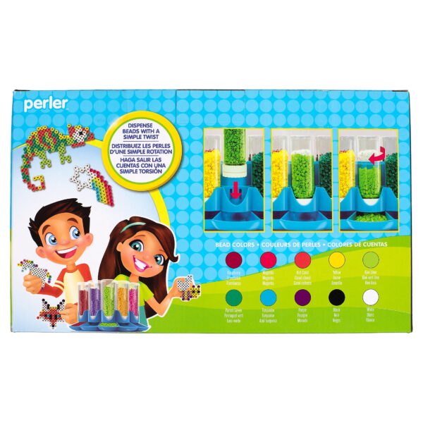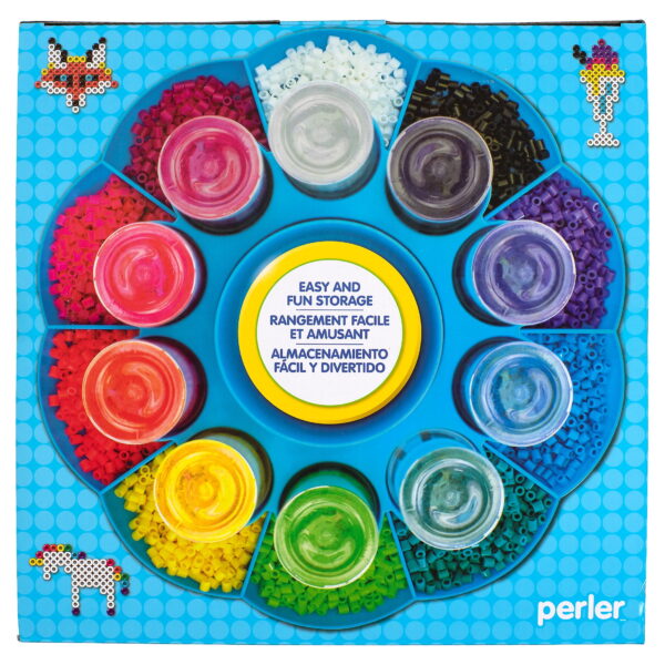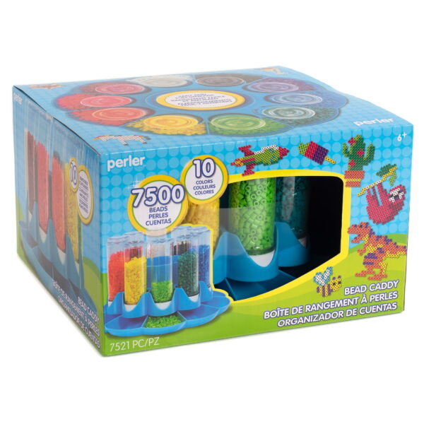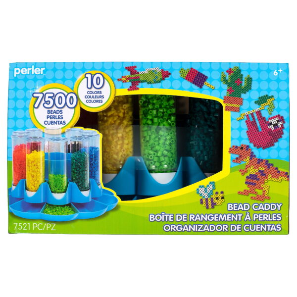 Perler Fuse Bead Caddy, Bead Storage and Dispenser System, Ages 6 and up: Contains 7500 beads, 10 clear containers with lids, and tray For use with Perler pegboards and ironing paper Clear containers fit in the included caddy and with one turn, the beads are dispensed into the tray Beads made of LDPE, a food-grade plastic free of harmful chemicals Ages 6 & up Ironing to be done by an adult only