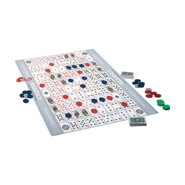 Play a card from your hand, place a chip on a corresponding space on the extra large game matwhen you have five in a row, its a SEQUENCE! Learn to block your opponents and remove their chips. Watch out for the Jacks THEYRE WILD! With a little strategy and a little luck youre a winner. Easy enough for children, challenging enough for adults! Recommended for ages 7 through adult, 2 to 12 Players. WARNING: CHOKING HAZARD — Small parts. Not for children under 3 yrs.