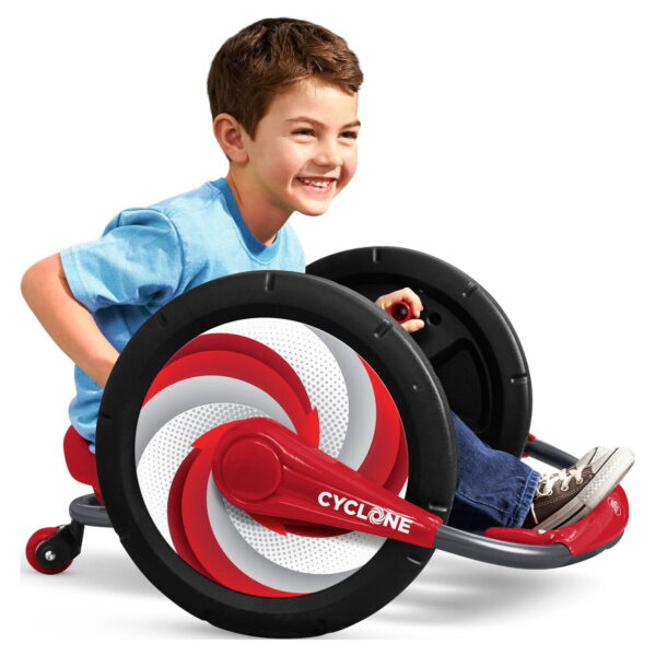Zoom, spin and grin with Radio Flyer’s Cyclone! Using only arm powered action, you can spin 360 degrees for unlimited fun. Whether you are zooming forward or rolling in reverse, the large 16 inch wheels offer a smooth ride. This ride-on also features comfort hand grips to guide your adventure. The ergonomic seat and rear caster wheel provide a smooth, comfortable and safe ride. The high-quality solid steel frame ensures years of classic Radio Flyer fun. Gender neutral design for all kids, boys, and girl to enjoy! For ages 3-7 years. Maximum weight capacity 69 lbs.