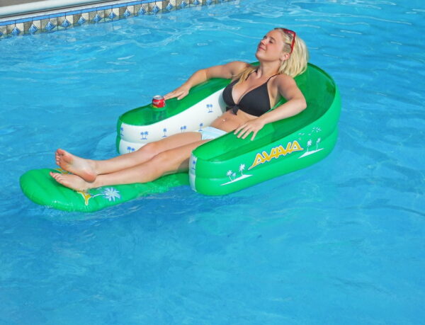 Rave Sports Flippin Float Pool Float: 41″ x 34″ x 18.5″ inflated Durable 16-gauge PVC construction Compact storage 3 air chambers 2 comfortable floating positions 1 recessed, molded drink holder Suitable for lake or pool lounging 225 lbs max weight Compact pool float recommended for ages 9+ 30-day limited warranty