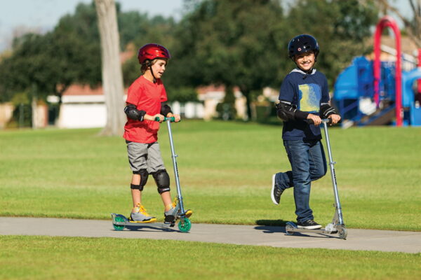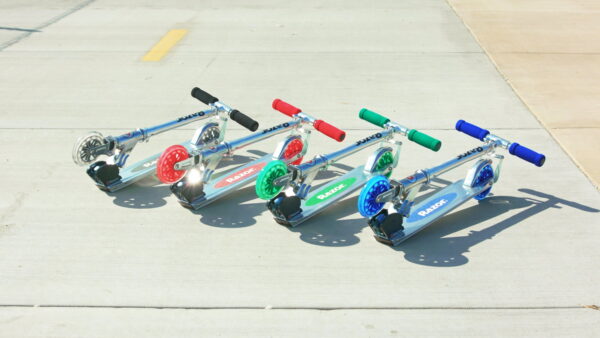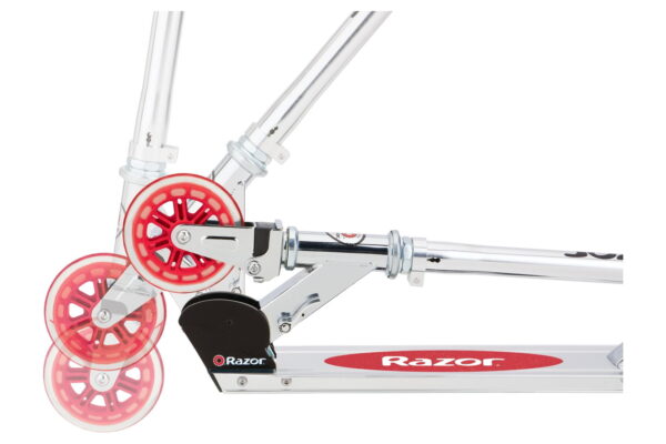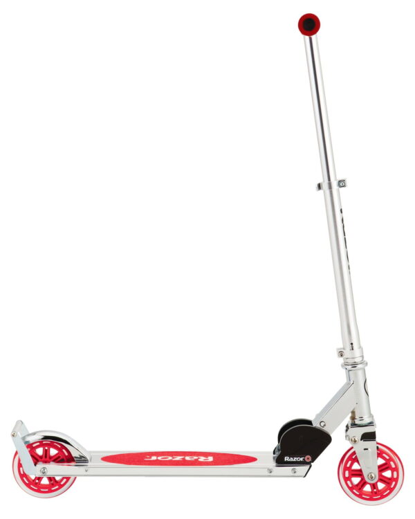 Made of top-quality aluminum, the A3 kick scooter is an upgraded version of the original Razor A kick scooter, with larger wheels and front vibration dampening suspension system to ensure a smoother ride and a wheelie bar for tricks. The scooter can be smoothly stopped by stepping on the rear-fender brake, on to urethane wheels. No assembly required, ready to ride out of the box, just unfold, set the handle bar height, and go. While there many products out there, choose Razor, a brand America knows and trusts. Accept no imitations. This is a smooth and fun ride that anyone can enjoy.