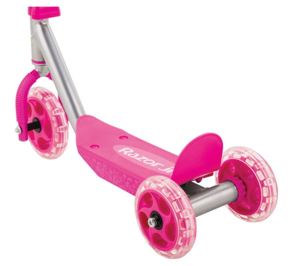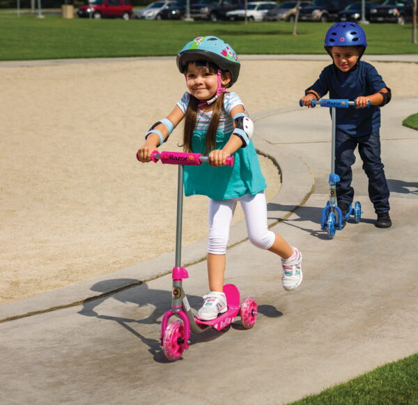 This scooter is the new and improved Razor Junior Lil’ Kick Scooter. Now little ones who’ve been envying the big kids’ Razor scooters can have one they can call their own. The scooter’s stand-alone, three-wheel design makes for a more stable ride, and the super slip-resistant deck keeps children on their feet. This scooter is great for speeding around the neighborhood. It requires just a few kicks to start this little scooter. Your child will enjoy a smoother ride when gliding along on this pink Razor scooter. This sturdy scooter has a welded steel frame and includes a padded handle bar. This durable T-bar scooter is lightweight for easy transport on outings, or when traveling. Surprise your adventuresome toddlers with the Junior Lil’ Kick Scooter. Be sure to educate children on the importance of helmet-usage. Surprise your adventuresome toddlers with the Junior Lil’ Kick Scooter, which can be assembled effortlessly with the included tools.
