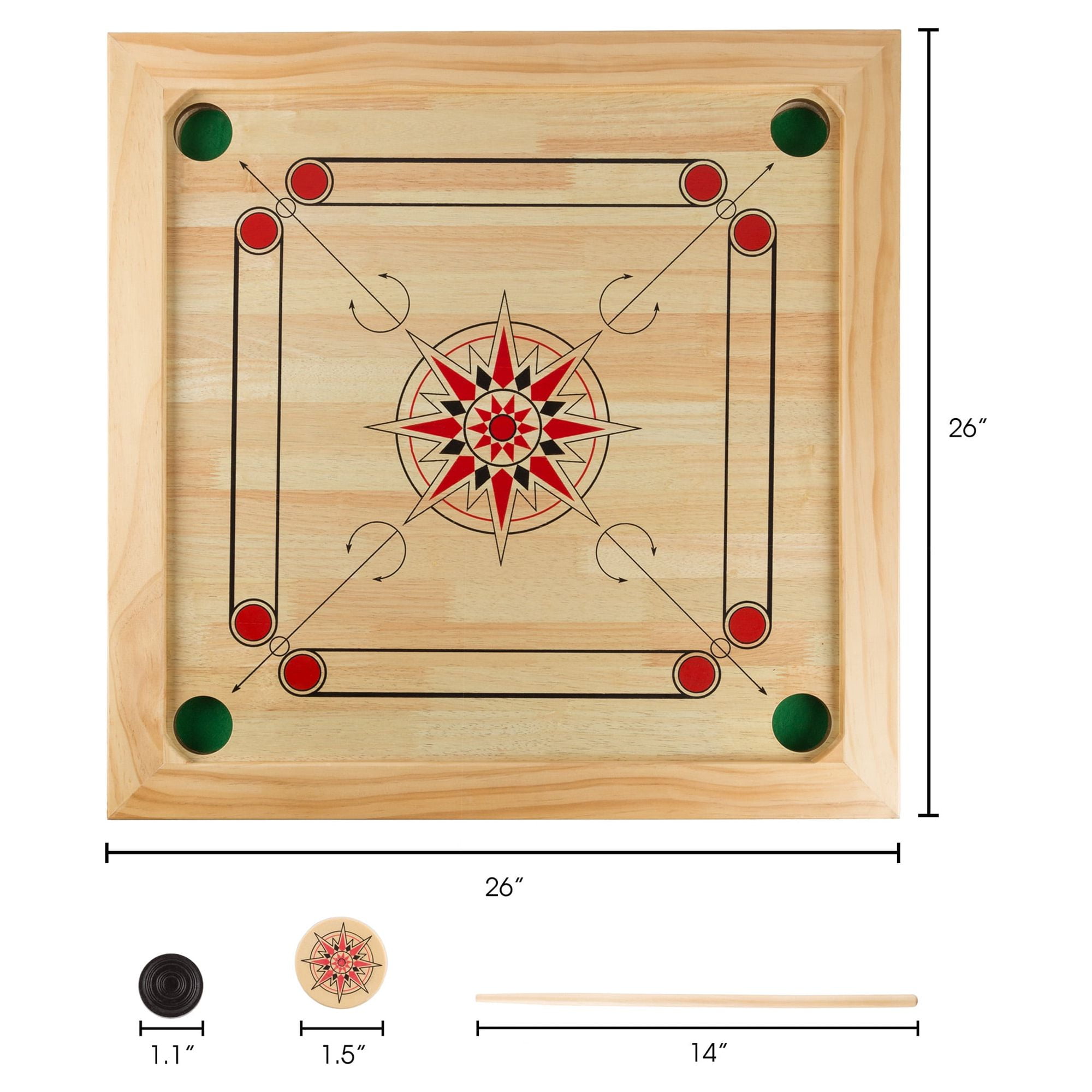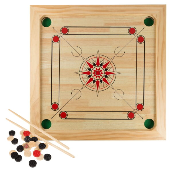 CLASSIC GAME- The goal of Carrom is to sink your 9 carrom-men as well as the red queen into the four corner pockets 2+ PLAYERS- Adults and kids of all ages can enjoy this table game. You can play 1-on-1 or in teams GAME PIECES- The set includes the game board, a 1.5″ striker, two 14″ long cue sticks, ten 1.1″ black wooden coins, ten 1.1″ beige wooden coins and two 1.1″ red queen coins MATERIALS- Pinewood DIMENSIONS- (L) 26″ x (W) 26″