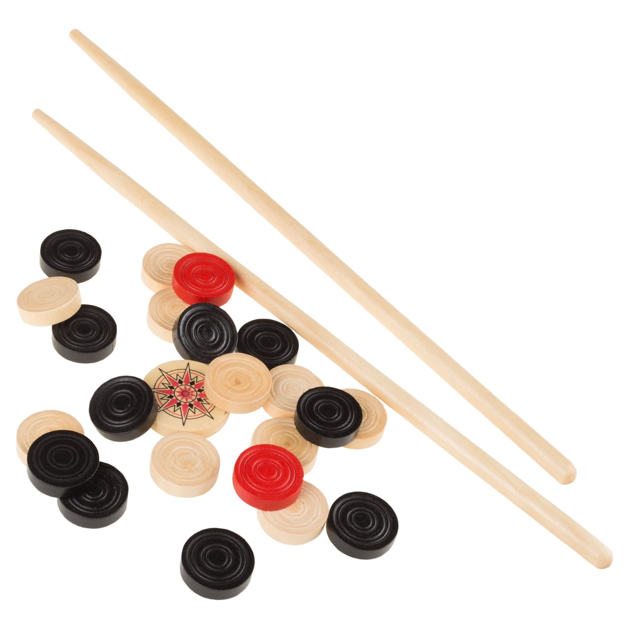 The Carrom Board Game by Rockin Rollers comes complete with the black and white coins known as the carrom-men, the two red queen coins, a striker and two 14 long cue sticks everything you need to play this classic game. Enjoy hours of fun playing this strategic game on the 26-inch square hand painted pinewood board with 4 pockets and 2-inch bumpers. Like Pool and Cronkinole, Carrom is a strike and shoot table game that can be played by kids or adults of any age.