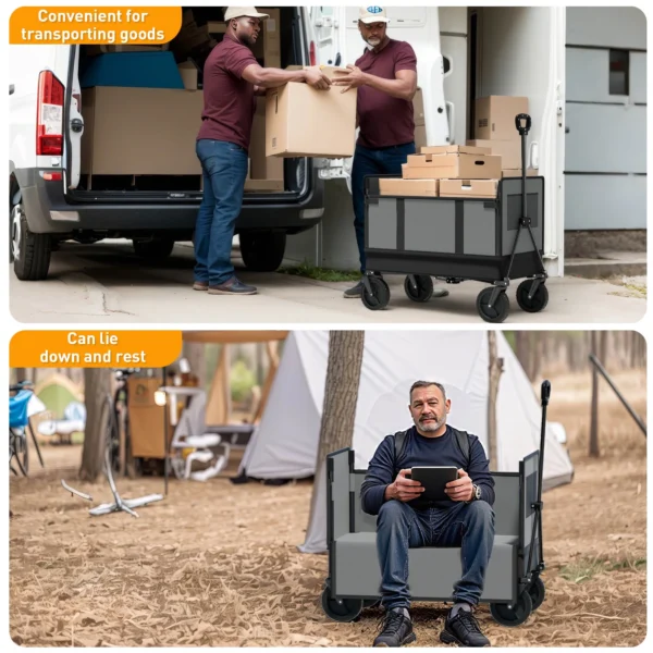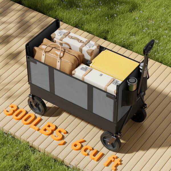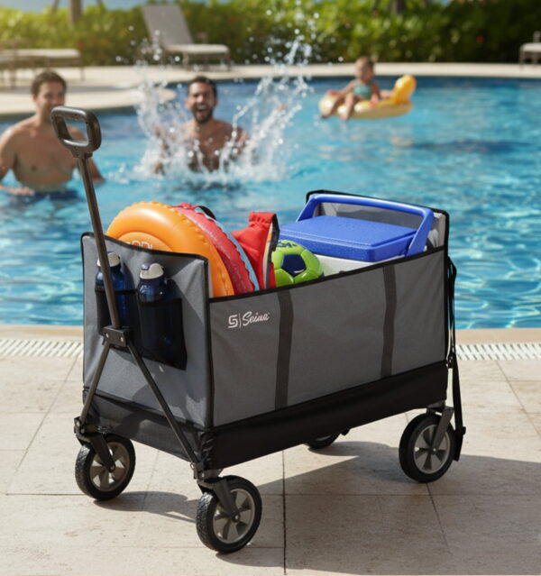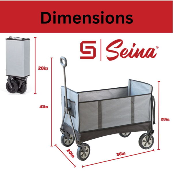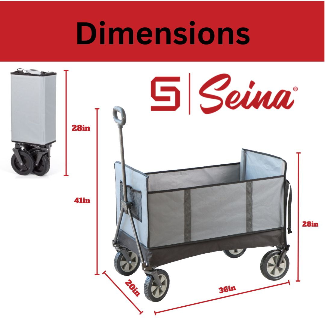 SEINAs everyday foldable wagon is an essential part of most families days. From general grocery getting cart to a full day at a zoo or sporting event, the outdoor wagon can definitely hold up to any job its entitled for that day. The utility fabric is both mildew and water resistant; and the steel frame is heavy duty enough to hold up to 300 pounds of groceries or anything you can throw in it. Foldable and easily compactible you can easily fit the collapsible wagon in your trunk, under your bed, in closets and anywhere pretty easily. Takes only seconds to set up and even less to fold up again. Turns a 5 person carrying job into 1 and because youre pulling and not carrying, it instantly makes it that much easier to haul things around town or your home with almost no effort. The sports wagon is smaller than other standard sized wagon carts with smaller wheels and smaller frame making it an even easier pulling weight for children. The wagon is extremely light weight and easier to pull than other garden wagons.