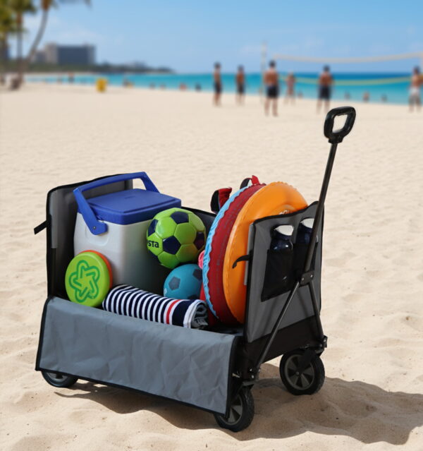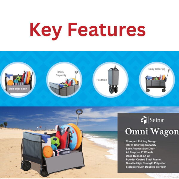 Seina Omni Multi-Purpose Outdoor Wagon in Gray, High Strength Polyester Fabric. Easy Access Side Door. Compact Folding Design