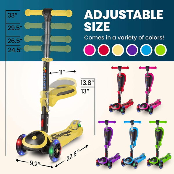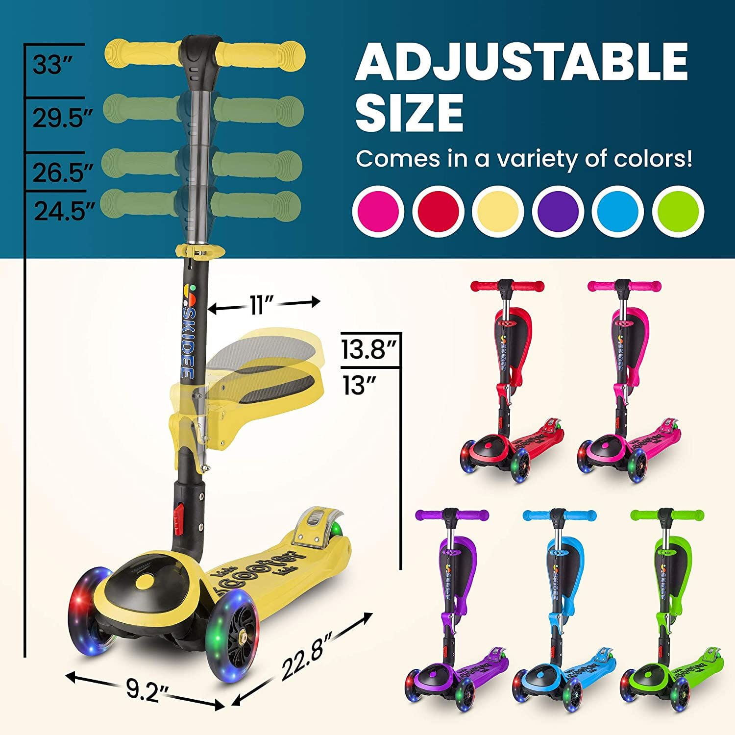 Skidee Kick Scooters for Kids, Adjustable Height, Foldable, LED Lights, Rear Brake, Ages 2-12, Yellow SKIDEE Kick Scooter is equipped with a wide standing board and 3 wheels that provide plenty of support and a perfectly balanced ride for kids ages 2-12 years old With its adjustable and removable seat, this Kids Scooter offers ultimate versatility. It allows your kids to comfortably scoot sitting or standing up Convincing your kids to engage in physical activities is made a lot easier with this Glowing Wheels. They automatically light up when kids ride the scooter no battery needed The combination of strong and sturdy design and Lean-to- Steer Technology makes it the most stable Scooter that will help them develop balance and coordination