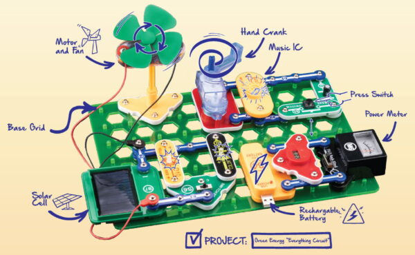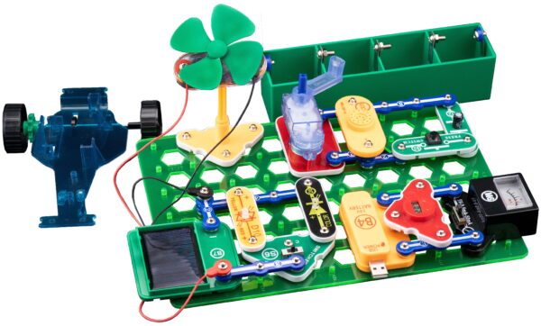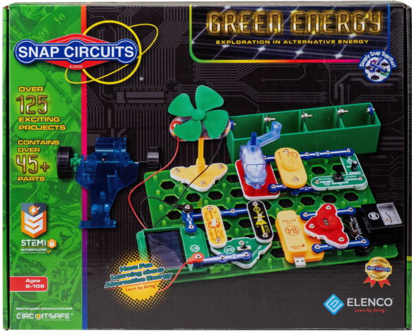 So many toys in a snap: Make dozens of cool electronic gadgets – all from one box! A safe and fun way to introduce children ages 8+ to the basics of electrical engineering and green energy! Build exciting projects and toys using the included colorful instruction book! Explore alternative energy in a snap: With 45+ parts build over 125 fun green-energy projects! Make your solar light clock, or mini car powered by wind energy, and even talk to your friends through Morse code! Includes think green manual to have fun learning about different types of alternative energy, like solar, wind, hand-crank, hydro, and even geothermal power Great gift: Give the gift of learning and fun this holiday season! Snap Circuits kits will keep kids busy and having fun all year round. Combine with other Snap Circuits kits for even more projects! No extra tools needed: Elenco snap circuit kits include everything you need to start learning immediately – and more. Unlike traditional electronics kits, no soldering or tools are required to build. The numbered and color-coded pieces snap easily onto the included plastic grid Award-winning kits!: We’re proud to produce high-quality products loved by kids, parents, and educators. Snap Circuits kits have won several awards – including the Specialty Toy of the Year Award, Seriously STEM! award, Good Housekeeping’s Best Toys, Purdue University’s Engineering Gift Guide, National Parenting Center’s Seal of Approval, Toy Insider’s Top Holiday Toys, placement on the Dr. Toy list of 100 Best Children’s Products, and placement on the Dr. Toy list of Best Educational products, and the “Stem Approved” Trustmark from Stem<.>org