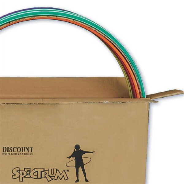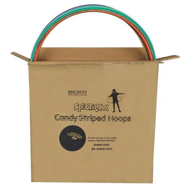 Retro Spiral Candy Stripe Design! 2 hoops each of 6 Spectrum colors. Practical and economical! Our least expensive, light-duty hoops. Get kids into hip-spinning fitness! Our colorful hoops feature a retro spiral candy stripe design! Our least expensive, light-duty hoops. Includes 2 hoops in each of our 6 Spectrum colors. Practical and economical, our hoops are made from extruded polyethylene with a 0.050″ wall thickness. The diameter listed is the nominal diameter, actual sets will include 6 hoops approx. 1″ smaller and 6 hoops approx. 1″ larger than the nominal diameter. For more durable hoops, we recommend our Spectrum No-Knott Hoops, Super Hoops or Flat Hoops. General InformationQuantity per Pack12Primary BrandSpectrumInstructions IncludednoYoungest Recommended Age5 YearsPhysical CharacteristicsBatteries RequirednoAssembly RequirednoIngredient & Materials InfoAllergen – LatexnoSafety and Regulatory InfoSafety Data Sheet (SDS)noPackaging & Environmental InfoCE Markno