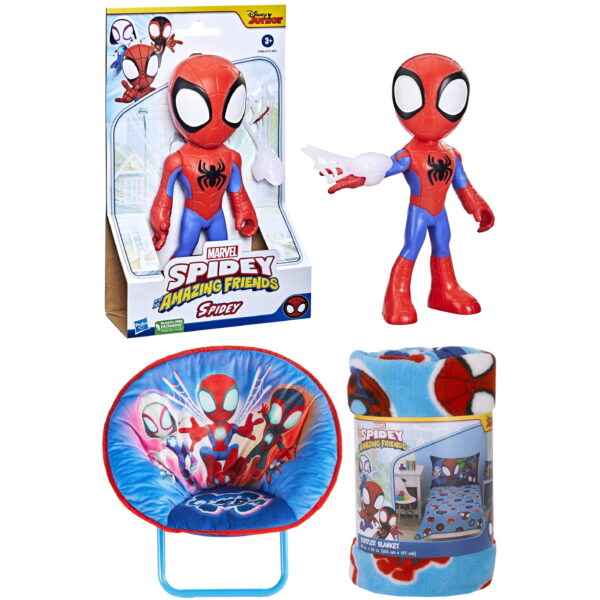SUPER HERO ACTION FIGURE: Web-out with the Spidey and His Amazing Friends Supersized Spidey Action Figure! This 9-inch-tall figure comes with a web accessory for ultimate imaginative play Saucer Chair DESIGN: This toddler saucer chair includes a Spidey and Friends design SIZE: 19″” x 19″” x 19″” – perfect for any toddler and the max weight is 81 lbs MATERIAL: Cushion is made out of a soft polyester material and the frame is made out of a durable metal Plush Blanket: Allover print blanket with Spidey faces in shades of red, white, and black on a blue background. SIZE blanket measures an extra large 40″ x 50″