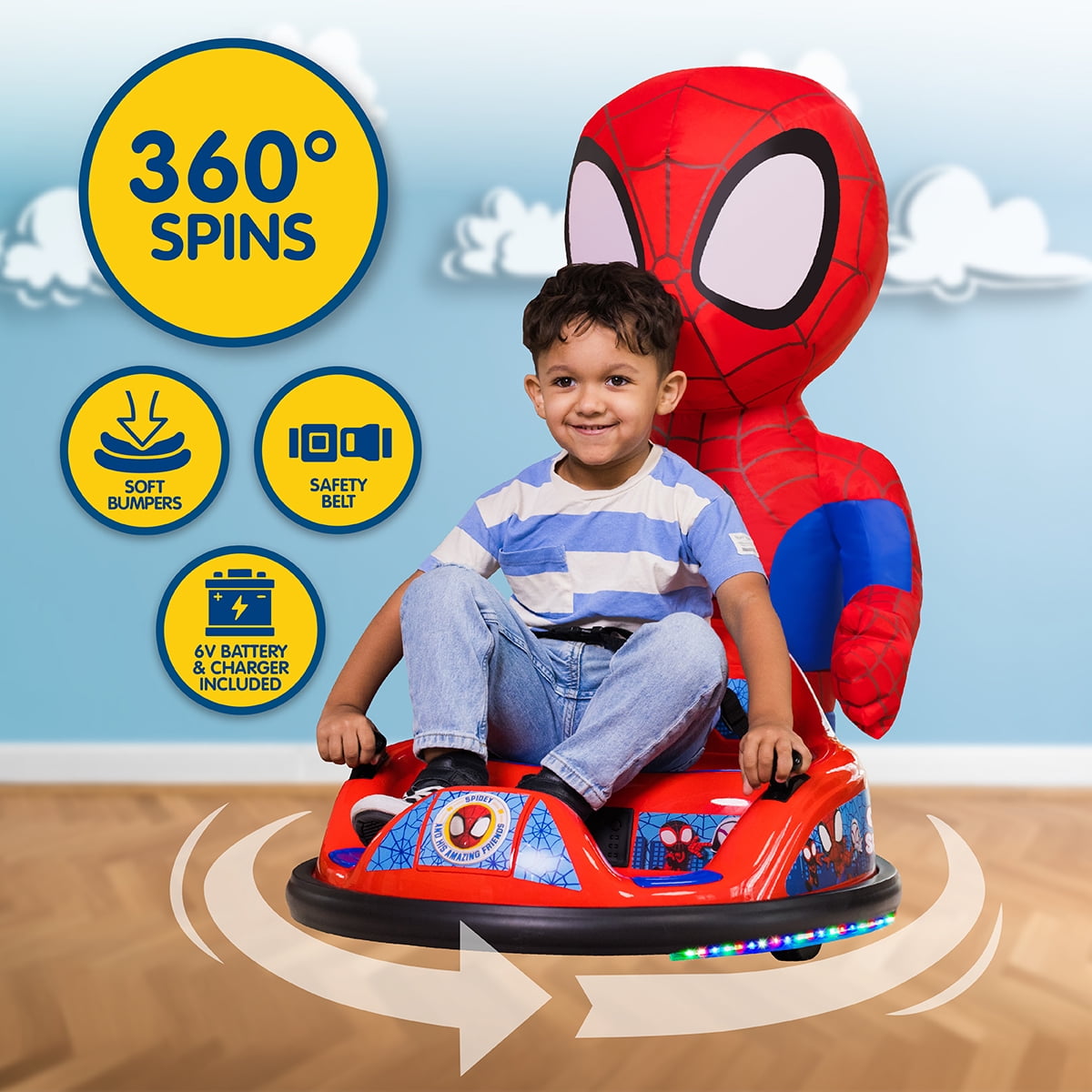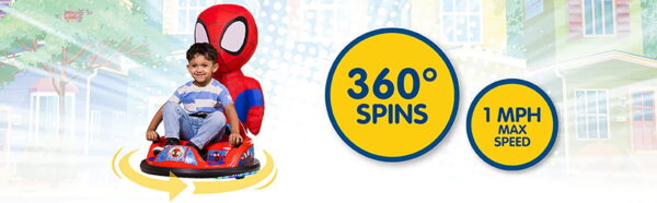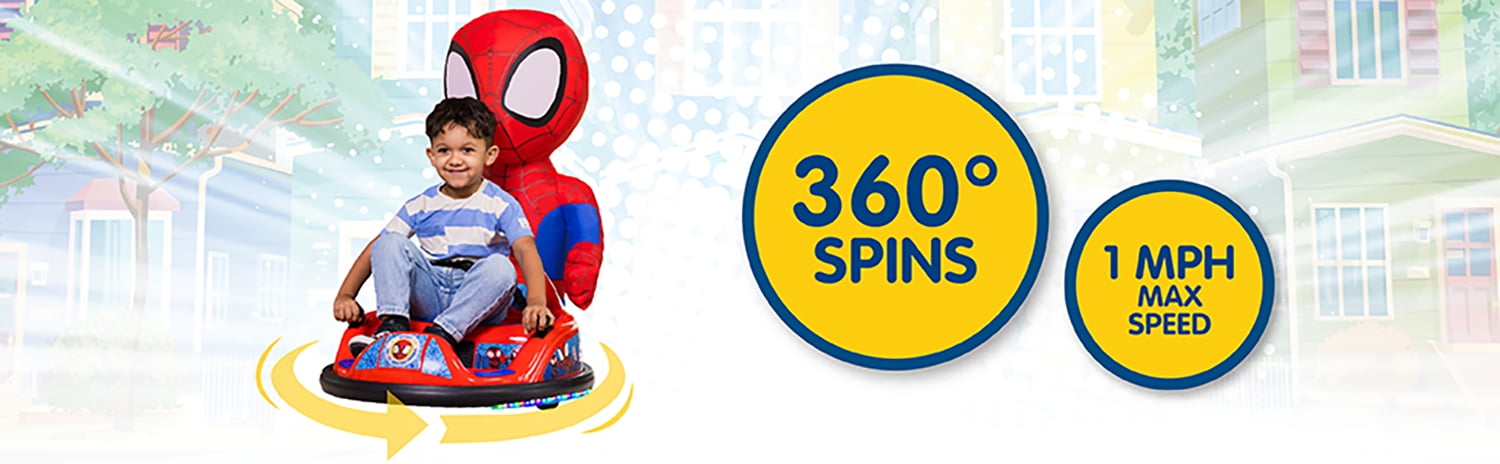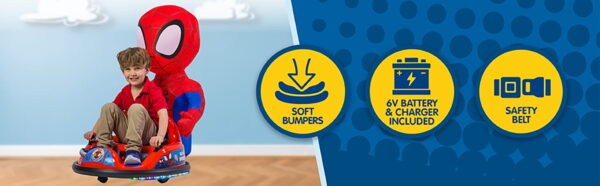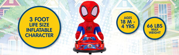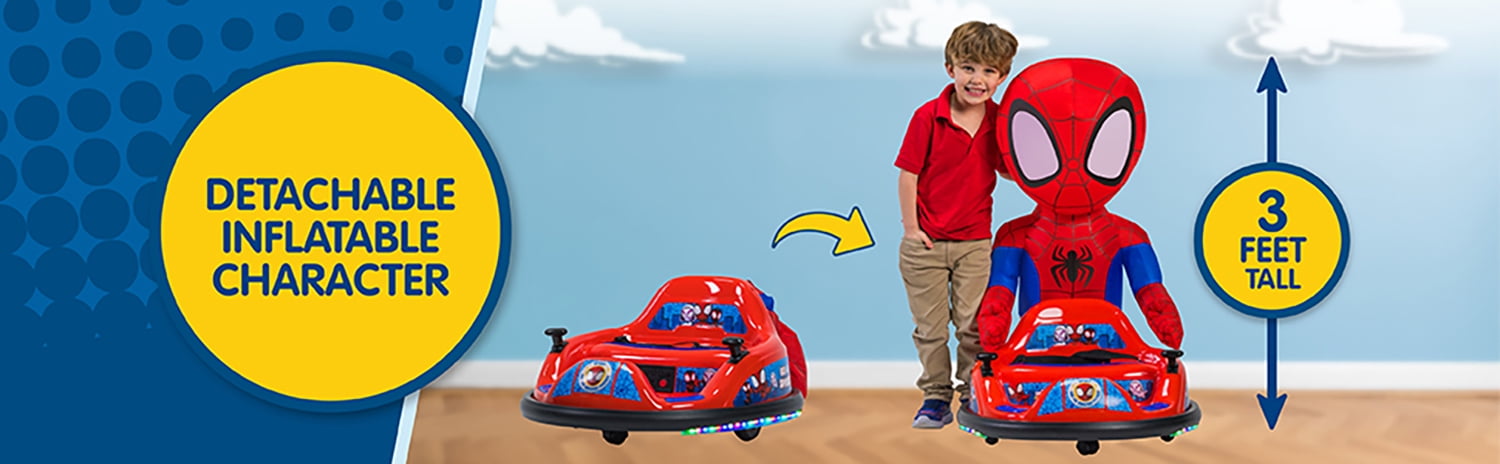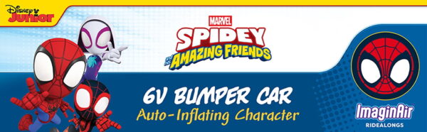 Spidey 6V ImaginAir Ride-On Bumper Car with Inflatable Character Inflatable Character: Spidey Inflatable instantly grows to 3 feet – just turn it on and go Safety: Features an adjustable seat belt, 1.5 MPH max speed, and soft rubber bumper to protect walls and furniture 360-Degree Spins: Dual joystick controls allow for easy steering and full 360-degree turns, ensuring endless giggles and smiles Flashing LED Lights: Comes with exciting flashing LED lights that glow bright, enhancing the fun experience Easy Assembly: Vehicle comes fully assembled; simply attach the bumper, charge the battery, and it’s ready to go Rechargeable: Includes a 6V rechargeable battery and 120V wall charger for continuous playtime Character Storage & Dual Play: Ride with or without the inflatable character for double the fun, and when playtime is over, simply deflate and store the character in the back of the car