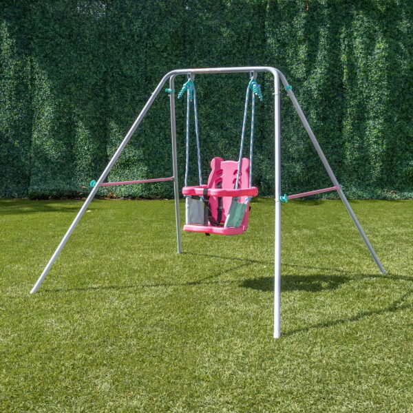 Little ones can have more fun in the backyard with this Sportspower Indoor/Outdoor My 1st Toddler Swing. This metal swing set features a foldable frame that makes it easy to store or to pack up and take on the go. The seat of the swing is made of durable molded plastic to last a long time. With a 5-point safety harness built in, it will keep children safe and secure as they play. This foldable, metal toddler swing is designed to be comfortable to sit in. Set it up in the yard or in an indoor playroom. The Sportspower My 1st Toddler swing features bright colors to entice little ones to play on it.