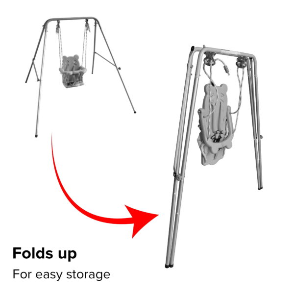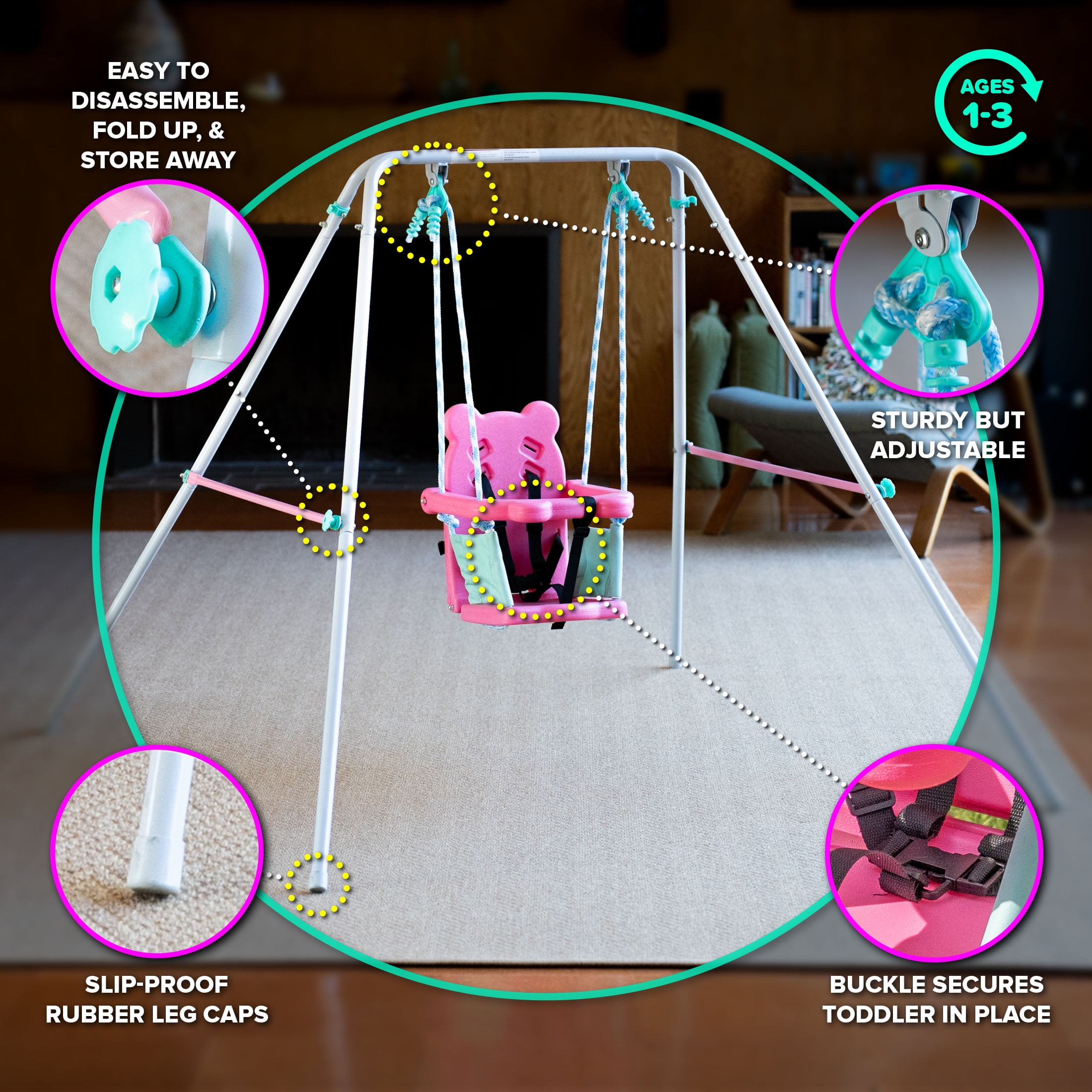 Foldable frame for storage and portability Molded plastic toddler seat Safety harness for security Sportspower My First Toddler swing for indoor and outdoor use Ensures safety and comfort as kids swing Adjustable seat height