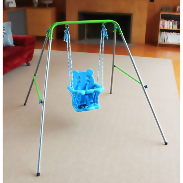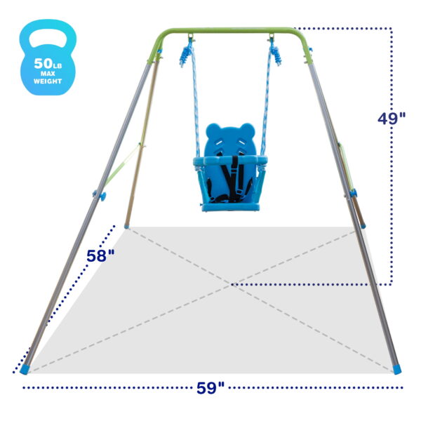 Foldable frame for storage and portability Molded plastic nursery seat lets your child swing with comfort Safety harness for security and safety Recommended for kids age 9 to 36 months Maximum weight limit of 55 pounds Meets and exceeds standards set by the American Society for Testing and Materials Includes a tool kit and the owner’s manual Color: Blue and green Dimensions (L x W x H): 4.33 x 4.58 x 3.92 feet Manufacturer warranty: 1-year warranty