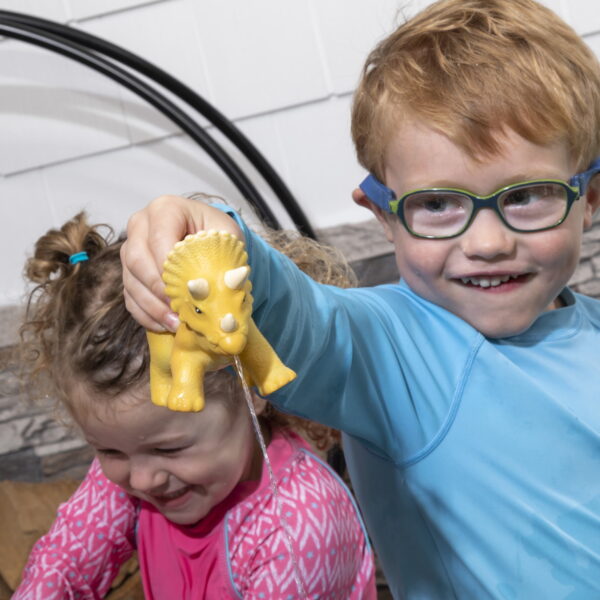 Create a mini water park right in your backyard with the Dino Showers Water Table by Step2. The two-tier toddler water table design creates a showering splash below! Just scoop up water from the pond and pour into the top tray to make it rain. Watch as the rainfall activates the maze-like spinners and ramps, a great way to show a cause and effect relationship. From the side flipper to the put-and-place maze pieces, kids will have lots of splish-splash fun with the included water table accessories! As an added benefit this toddler water table is eligible for: Pickup Today and Ship From Store to make your shopping experience more convenient!