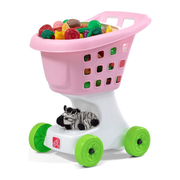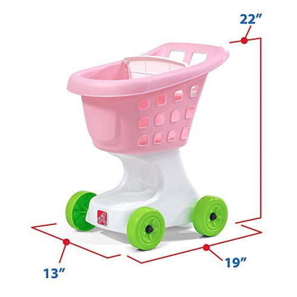 Classic Step2 shopping cart styling mimics real grocery carts adult role models use at the store. Vibrant colored toy shopping cart has a large basket for tons of shopping treasures! Lightweight design, large handles, and smooth molded wheels let toddlers push this grocery cart easily. Bonus space below the basket can store more pretend purchases! Toddlers can take their favorite stuffed animal friend along for the ride in the shopping carts doll seat. Easy to clean! Use disinfectant wipes or household cleaners whenever you want! In the box: Shopping cart base and basket, wheels, and doll seat.
