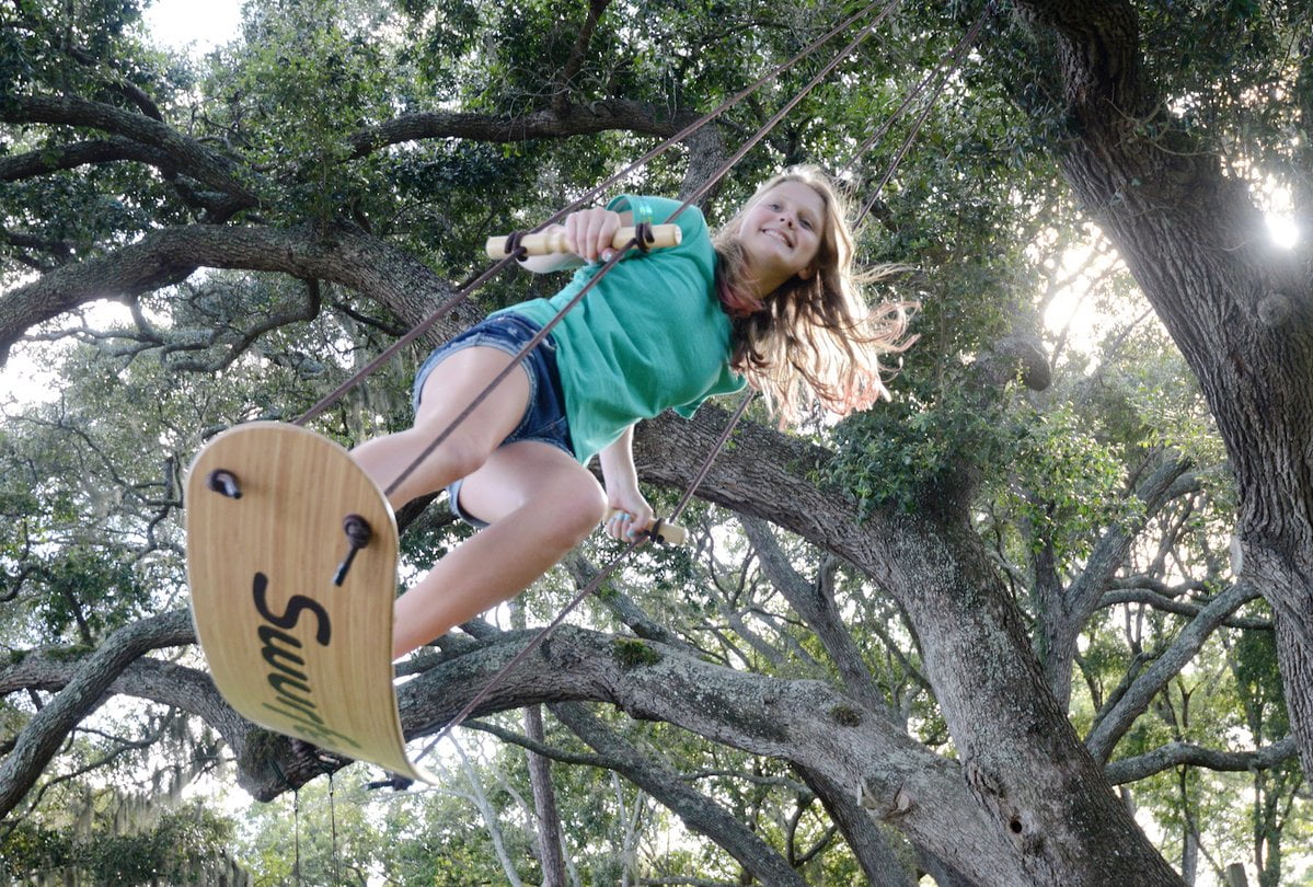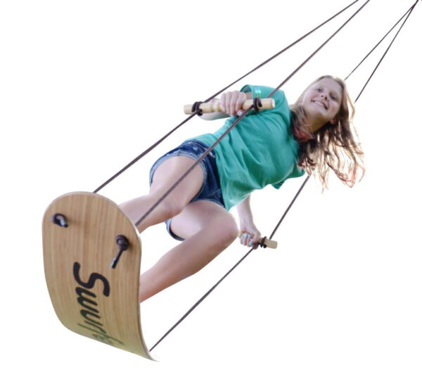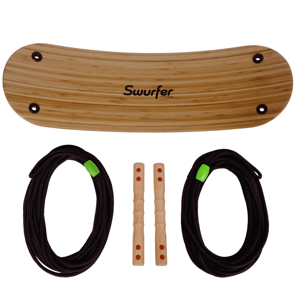 Surf the air with the original Swurfer! This outdoor stand up swing for kids and adults is reinventing the backyard hanging swing. For use both as a tree swing or as an add-on to a swing set, its unique curved shape allows kids and adults (up to 200 lbs) to soar through the air, providing more power, moves, and fun with each swing! Each swing board is individually shaped, sanded, and finished by hand to ensure optimum quality and safety. The handles on this tree swing adjust for any height, while the versatile Swurfer is great for both those looking for either a calm gliding swing or an exciting ride! The Swurfer sets up in minutes and comes with an easy-to-follow instillation guide and all necessary components. The adjustable handles work for users of any height. The Swurfer is a carefree way to build your core and perfect your balance while swinging your cares away. Swurf Grips not included.