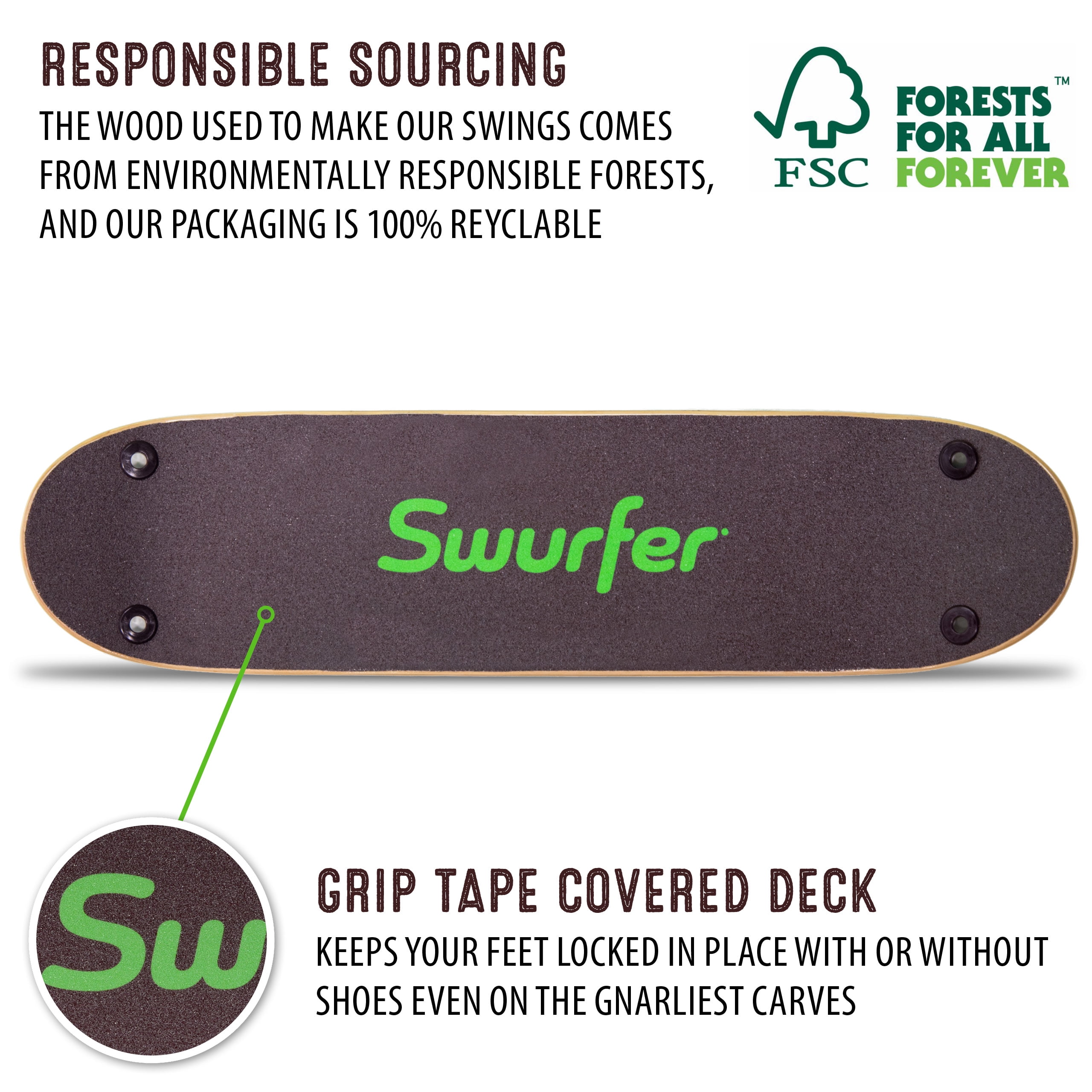 Skate the air with the original Swurfer TreeSkate! Unlike the Original Swurfers curved deck design, the TreeSkate features a flat, tapered deck that encourages pumping your legs to generate huge amounts of momentum and swing way up into the sky. The hand-crafted design features a standard 31-inch skateboard deck that comes in three eye-popping graphic varieties: the natural wood finish, Undawadda, and Waves. Grip tape ensures your feet stay locked in place at all times and provides the traction necessary to really put weight into your turns. A fun way to get a solid workout in, the TreeSkate requires heavy glute and thigh activation, while maintaining your balance and keeping your body centered between the handles is a great core workout. Everything needed for a fast setup is included, and the universal straps are rated for 6000 lbs and work with all Swurfer swings, so changing setup or adjusting hanging height takes just seconds. The straps fit around tree branches, jungle gyms, and backyard patios. Locking carabiners ensure the TreeSkate never falls and your kids are always safe. Trees are essential to many things in natureclean air, clean water, and a clean climate. A healthy environment sustains the source of the wood for our Swurfer swings, nurtures the trees that our swings hang from, and supplies the shade that people enjoy on a hot summer day. Swurfer is dedicated to encouraging families and children to enjoy the gift of nature, and fostering sustainability of our natural resource is not only the smart thing to do but the right one. With this ideal in mind, Swurfer wood products are constructed using wood certified by the Forest Stewardship Council (FSC), a non-profit organization dedicated to promoting responsible forestry. We have furthered our dedication in sustaining this precious resource by joining the Arbor Day Foundation last year to publicly launch the Time for Trees initiative. This ambitious project aims to plant 100 million trees and inspire 5 million tree planters by 2022, the 150th anniversary of the founding of Arbor Day. We are proud that Swurfer is playing a role in this important large-scale effort. Swurfer believes that every day is Earth Day, and we stand by our commitment to helping develop a sustainable future in both practice and action.