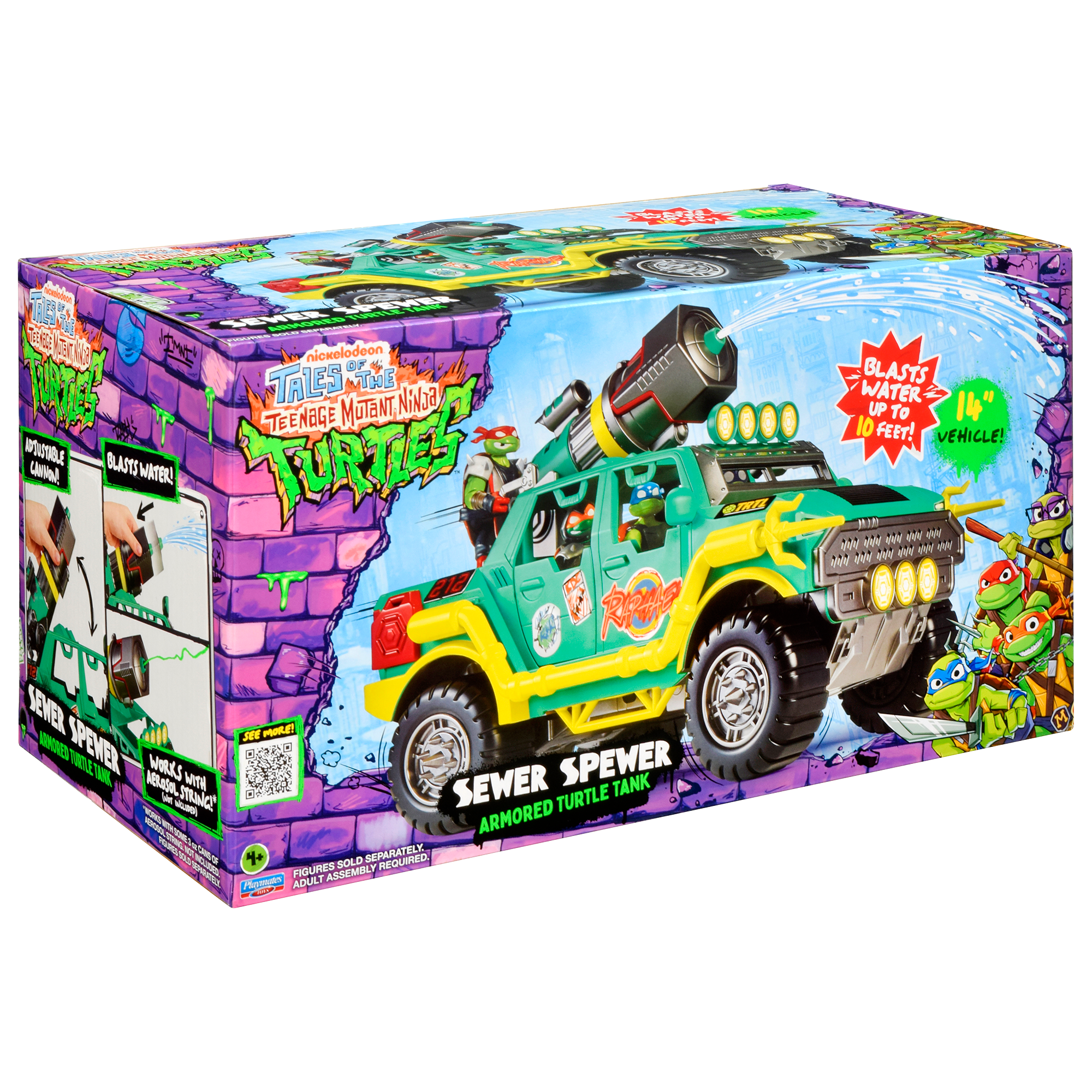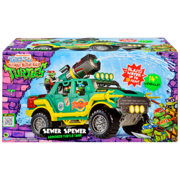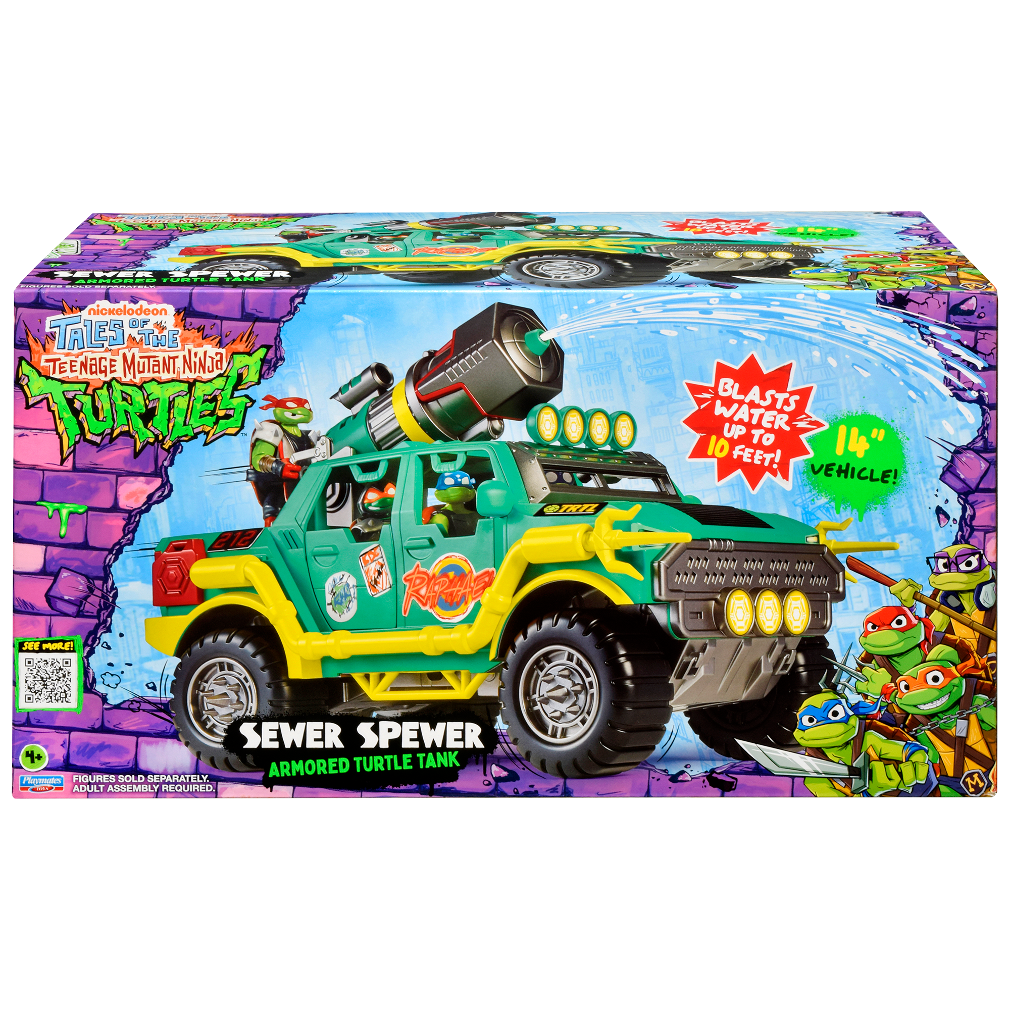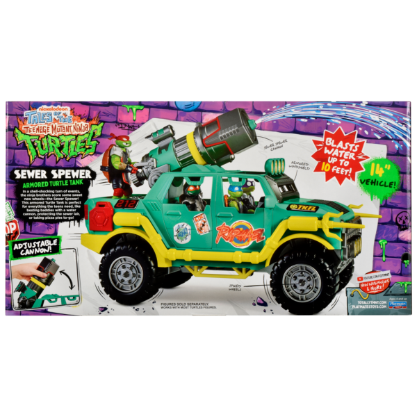 Between mutanimal battles and city-saving missions, these heroes in a half shell need to travel twice as fast. In a shell-shocking turn of events, the ninja brothers score some sweet new wheelsthe Sewer Spewer! This armored Turtle Tank is perfect for everything the teens need, like besting baddies, protecting the sewer lair, or picking up pizza pies to-go! AUTHENTIC: The Sewer Spewer is sculpted and decorated to match the animated Turtle Tank from the Tales of the Teenage Mutant Ninja Turtles TV series. SEWER SPEWIN’ ACTION: Press the cap down on the cannon to shoot water up to 10 feet away; remove the cap to refill and reuse the water tank inside the cannon for endless action (cannon is also compatible with some aerosol string canisters, sold separately). ROLL INTO ACTION: Free-rolling wheels allow the Turtle Tank to ride into battle, with opening back doors so the Turtles can quickly join the fight. RIDE IN STYLE: The Sewer Spewer fits the entire Turtle team, with seats inside the vehicle and standing space in the truck bed. COLLECT THEM ALL: Collect all the Tales of the Teenage Mutant Ninja Turtles action figures and accessories from Playmates Toys, your headquarters for Teenage Mutant Ninja Turtles toys