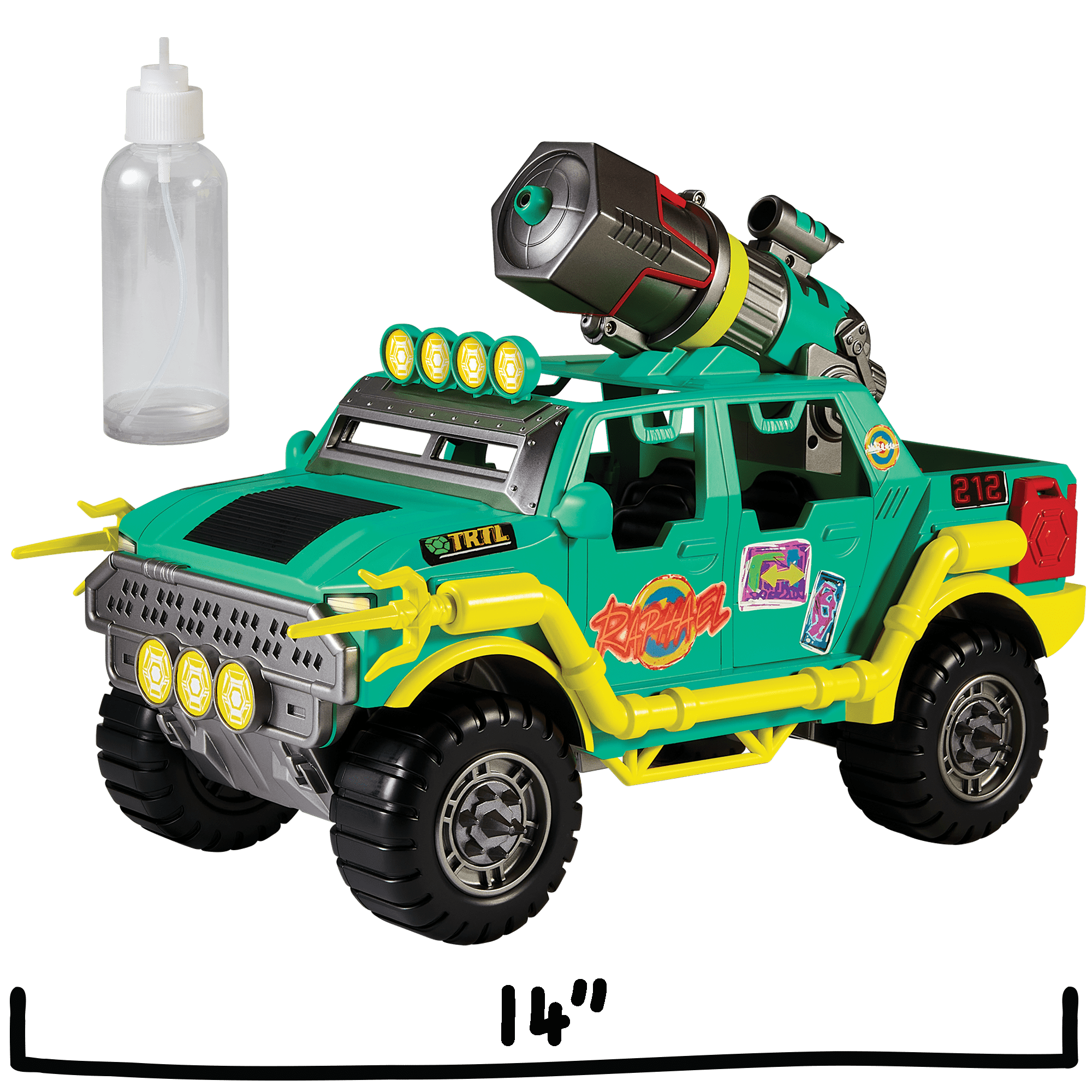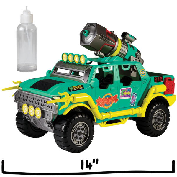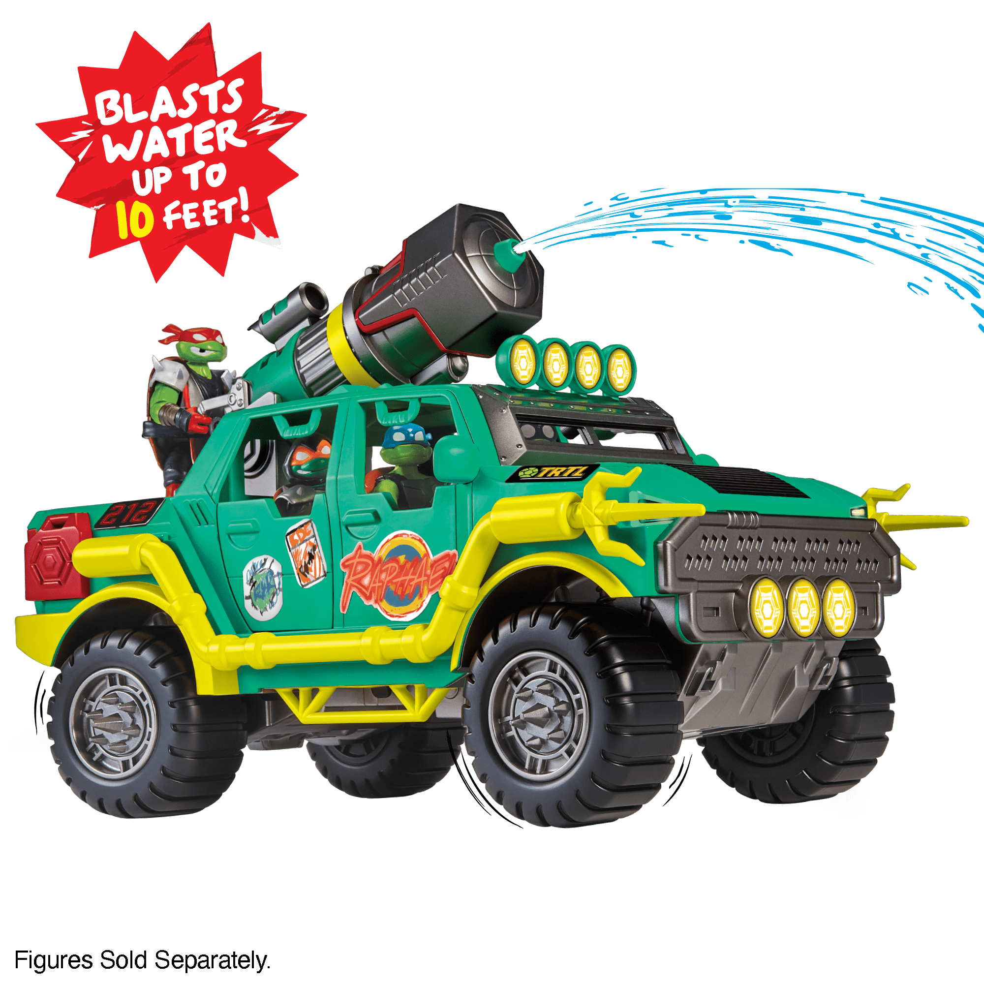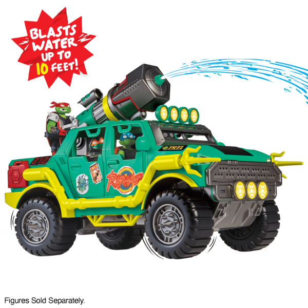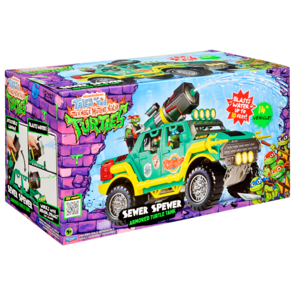 Between mutanimal battles and city-saving missions, these heroes in a half shell need to travel twice as fast. In a shell-shocking turn of events, the ninja brothers score some sweet new wheelsthe Sewer Spewer! This armored Turtle Tank is perfect for everything the teens need, like besting baddies, protecting the sewer lair, or picking up pizza pies to-go! AUTHENTIC: The Sewer Spewer is sculpted and decorated to match the animated Turtle Tank from the Tales of the Teenage Mutant Ninja Turtles TV series. SEWER SPEWIN’ ACTION: Press the cap down on the cannon to shoot water up to 10 feet away; remove the cap to refill and reuse the water tank inside the cannon for endless action (cannon is also compatible with some aerosol string canisters, sold separately). ROLL INTO ACTION: Free-rolling wheels allow the Turtle Tank to ride into battle, with opening back doors so the Turtles can quickly join the fight. RIDE IN STYLE: The Sewer Spewer fits the entire Turtle team, with seats inside the vehicle and standing space in the truck bed. COLLECT THEM ALL: Collect all the Tales of the Teenage Mutant Ninja Turtles action figures and accessories from Playmates Toys, your headquarters for Teenage Mutant Ninja Turtles toys