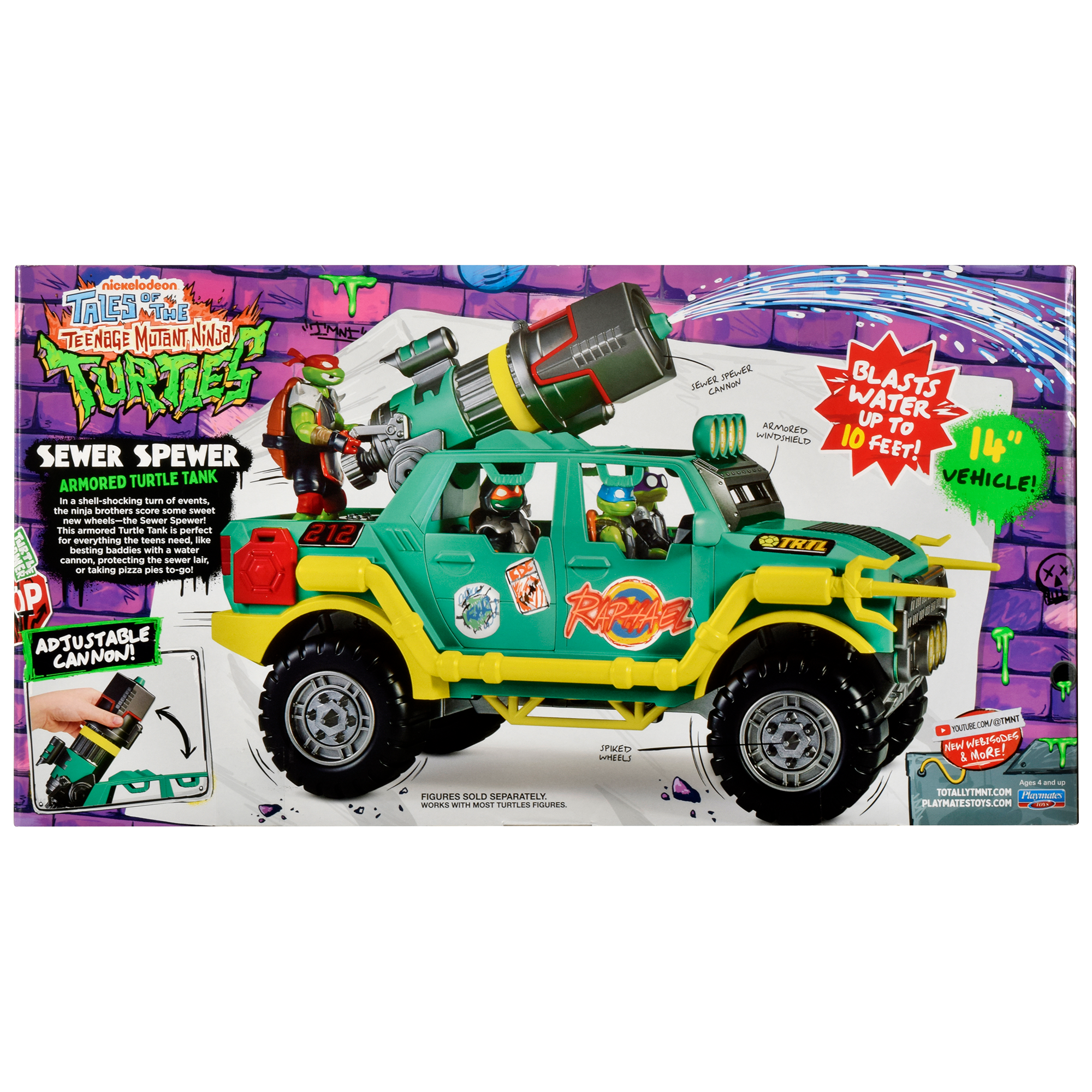 AUTHENTIC: The Sewer Spewer is sculpted and decorated to match the animated Turtle Tank from the Tales of the Teenage Mutant Ninja Turtles TV series SEWER SPEWIN’ ACTION: Press the cap down on the cannon to shoot water up to 10 feet away; remove the cap to refill and reuse the water tank inside the cannon for endless action (cannon is also compatible with some aerosol string canisters, sold separately) ROLL INTO ACTION: Free-rolling wheels allow the Turtle Tank to ride into battle, with opening back doors so the Turtles can quickly join the fight RIDE IN STYLE: The Sewer Spewer fits the entire Turtle team, with seats inside the vehicle and standing space in the truck bed COLLECT THEM ALL: Collect all the Tales of the Teenage Mutant Ninja Turtles action figures and accessories from Playmates Toys, your headquarters for Teenage Mutant Ninja Turtles toys