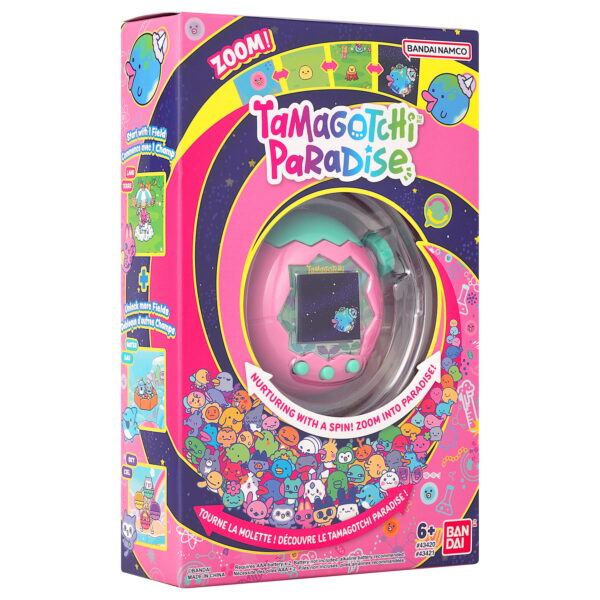 ZOOM. Nurture with a spin! Zoom into Paradise! Turn the dial to take care of your Tamagotchi character. Zoom from cell to space for traditional nurturing play – clean the poop, feed them delicious food and make them feel better! Play new mini games and nurturing activities and shop in the new LAB MODE CHARACTERS. Raise more than 50,000 Tamagotchi characters. Depending on the environment and the way you take care of your Tamagotchi character, you can grow over 50 different characters in 12 species. Plus, BREED play creates more Tamagotchi characters by bringing parent’s genes to the next generation CONNECT. Connect with friend’s device directly to see how your characters interact – is it a good match or a bad match? THREE FIELDS. Start in the Land field and unlock the Water and Sky fields for different play and characters. The Pink Land device has a pretty pink and green shell AND MORE. Choose from nine languages (English, French, Spanish, German, Portuguese, Italian, Chinese, Korean and Japanese) Requires 3-AAA batteries (not included) For ages 6 and up