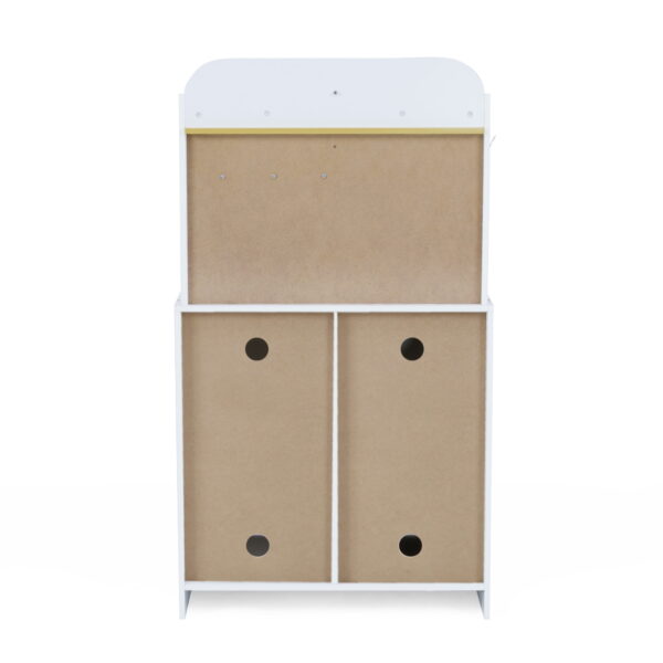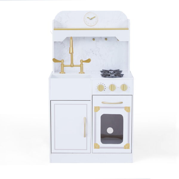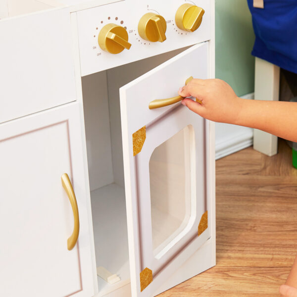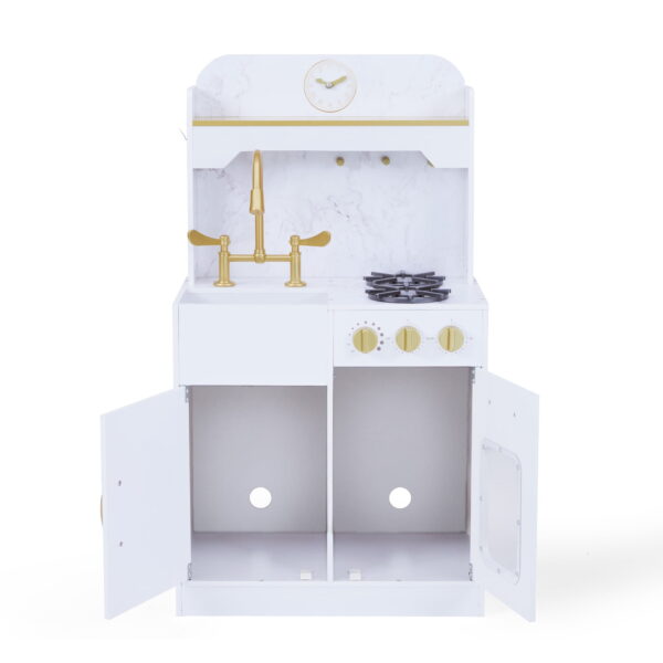 Stylish white finish, gold hardware, and a faux white marble backsplash accent the classic style of this compact kitchenette that features a popular deep farmhouse sink Interactive details, such as turning and clicking knobs on the stove and moving handles on the gooseneck faucet bring a realistic experience to playing pretend Includes 11 kitchen accessories – pots & pans, spatulas, pretend seasoning, and play food, along with a telephone to multitask while chatting with friends Made of engineered wood (MDF), this 19.76″ L x 12.01″ W x 35.51 ” H compact, sturdy unit is perfect for playrooms, bedrooms, and play areas where space is at a premium Plenty of storage space for easy clean-up – the oven opens, as does a cabinet below the sink, with plenty of room for play food, dishware, and cookware; a handy shelf and hooks on the backsplash can hold spatulas, etc. Children that pretend play develop many interpersonal skills – communication, empathy, listening, collaboration, emotional intelligence, problem-solving