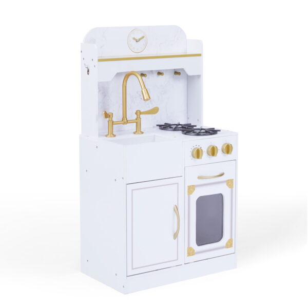 Teamson Kids’ Versailles Petite Classic Kids Play Kitchen’s classic white finish with gold hardware and faux marble backsplash is perfect for your little chef. Includes interactive details such as the turning knobs and faucet levers. The deep farmhouse sink provides a space to wash pretend vegetables or clean the dishes, while the hooks and storage spaces offer plenty of for cookware and pretend food. The set also includes 11 accessories, such as a phone, pots and pans, spatulas, and seasoning.