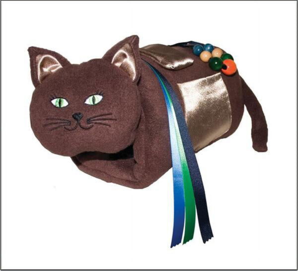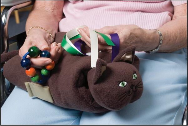 Muff will warm hands and double as a loveable plush cat that can comfort and calm agitated clients through repetitively tactile stimulation. Tethered within the center of the muff is a very soft, squeezable ball. On the outside of the muff, there are three exchangable gadgets that include a sealed satin bag of movable marbles, a strand of textured ribbons and a loop of colorful wooden beads which all offer stimulating hand activities. Hook and loop tab provides additional stimulation. Machine wash and dry. 14″ long (not including the 4″tail) x 8″ wide x approx. 4″ H. Chocolate brown.