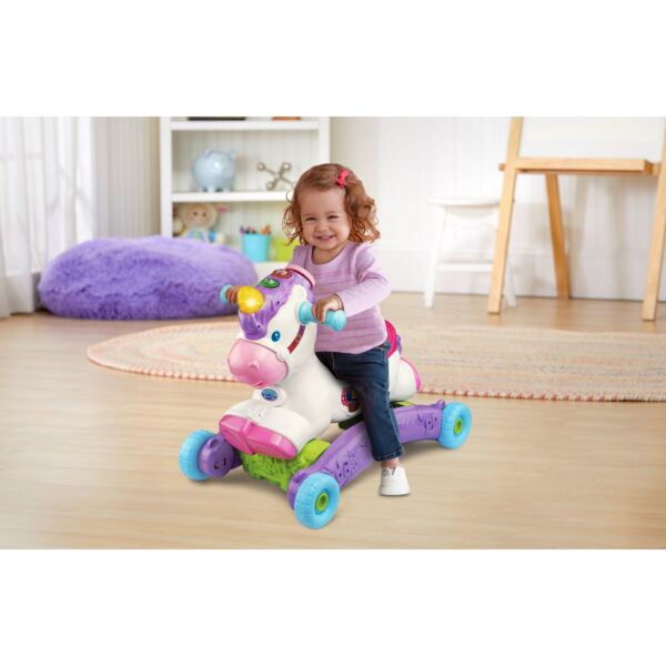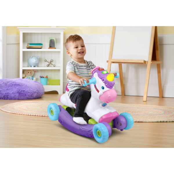 This unicorn has a transformable base to change it from a rocker to a ride-on toy as your child grows Learn about colors and encourage imaginative play with songs, melodies and playful phrases As your toddler rocks and rides, the motion sensor responds with magical sounds and music to encourage movement Switch between Learning and Adventure modes to double the fun Intended for ages 12-36 months; maximum weight 42 pounds; requires 2 AAA batteries; batteries included for demo purposes only; new batteries recommended for regular use. Unisex VTech’s 2-in-1 rocker-to-rider unicorn grows with your child and makes a perfect birthday present or holiday gift for children 13 years old