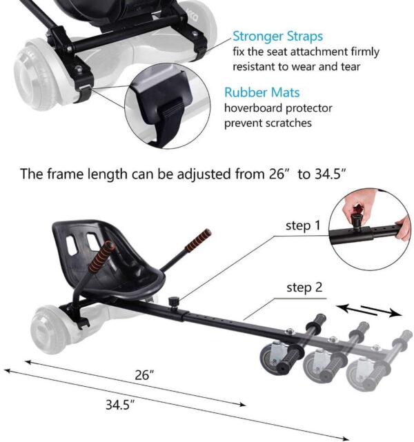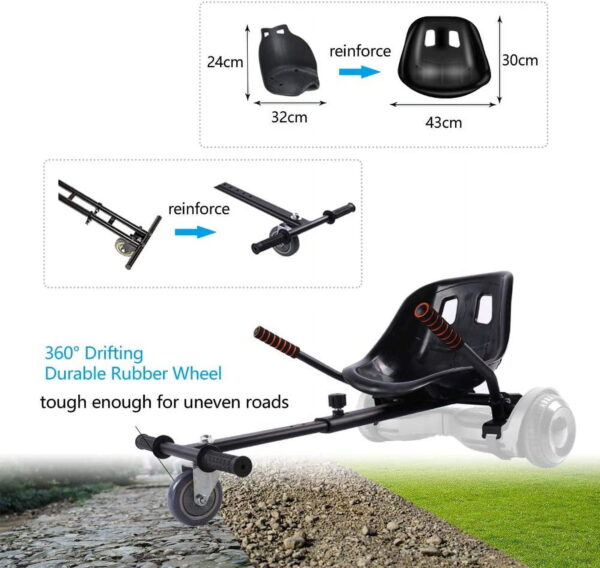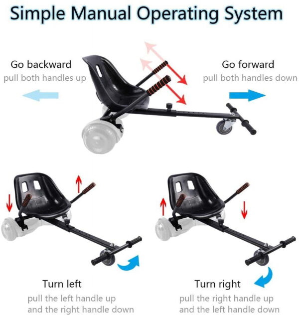 Max load:200 lbs User age:13 years old Kart Equipment ONLY – Attention: Balance Board Not Included. Hover-Rider Accessorie Seat for Two Wheel Hover-Rider 6″ and 10″ Only Easy to install, takes only about a minute to transform your Hover-Rider into Electric Go Kart Perfect to make you enjoy the happiness with your Hover-Rider BoardKart Equipment – Balance Board Not Included, the length is adjustable, cruise like a GO-KART PLEASE NOTE: Balance Board Not Included