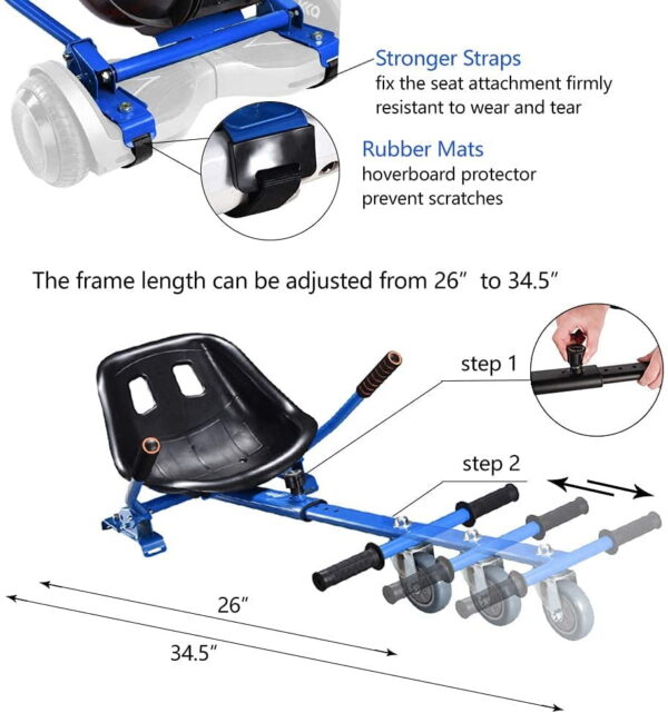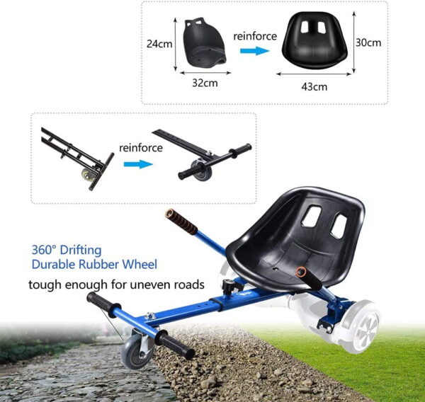 Max load:200 lbs User age:13 years old Kart Equipment ONLY – Attention: Balance Board Not Included. Hover-Rider Accessorie Seat for Two Wheel Hover-Rider 6″ and 10″ Only Easy to install, takes only about a minute to transform your Hover-Rider into Electric Go Kart Perfect to make you enjoy the happiness with your Hover-Rider BoardKart Equipment – Balance Board Not Included, the length is adjustable, cruise like a GO-KART PLEASE NOTE: Balance Board Not Included