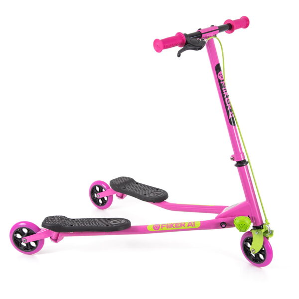 The Original Fliker A1 Experience: Yvolution is the original Fliker Company, setting the standard for self-propelled scooters. The Fliker A1 is our iconic ride, perfect for drifting, carving, and freestyle fun! With its unique innovative design, kids can propel themselves forward by shifting their weight from side to side, making for smooth drifting and epic freestyle carving. The more they wiggle, the faster they go instant speed, endless excitement! Foldable and Portable: When the adventure takes a break, the Fliker A1 folds down for easy carrying around town or convenient storage at home or in the car. It’s the perfect companion for on-the-go fun! Safety Meets Fun: Safety is our priority! The Fliker A1 features two decks for added stability, anti-slip footplates for a secure grip, and a quick-response brake for increased control. Kids can ride confidently, knowing they’re in good hands or, rather, good wheels! Colorful Fun for Everyone: The Fliker A1 comes in a range of vibrant colors, adding an extra dose of excitement to every ride. Age: 5 years old and up User height from 113cm / 44.4 inches Size (L x W x H): 33.7 x 21.5 x 29.7 inches Max Rider Weight: 110 lbs Folding system for storage and easy transportation Improved footplates for maximum control Unisex Durable PU caster wheels for drifting and pulling tricks Available in green or pink Fliker weight is 13lbs