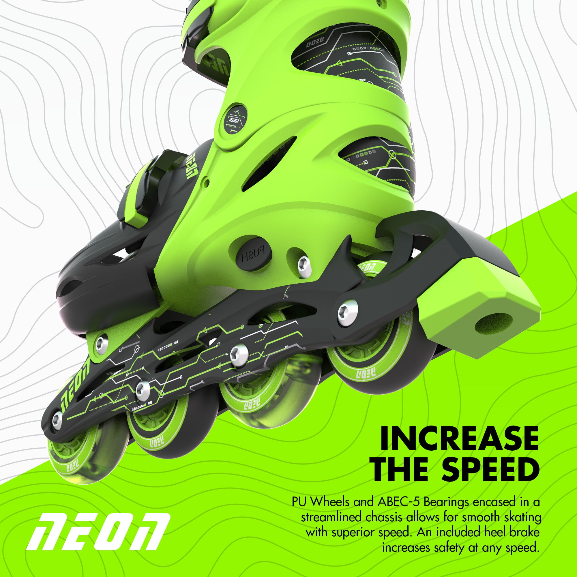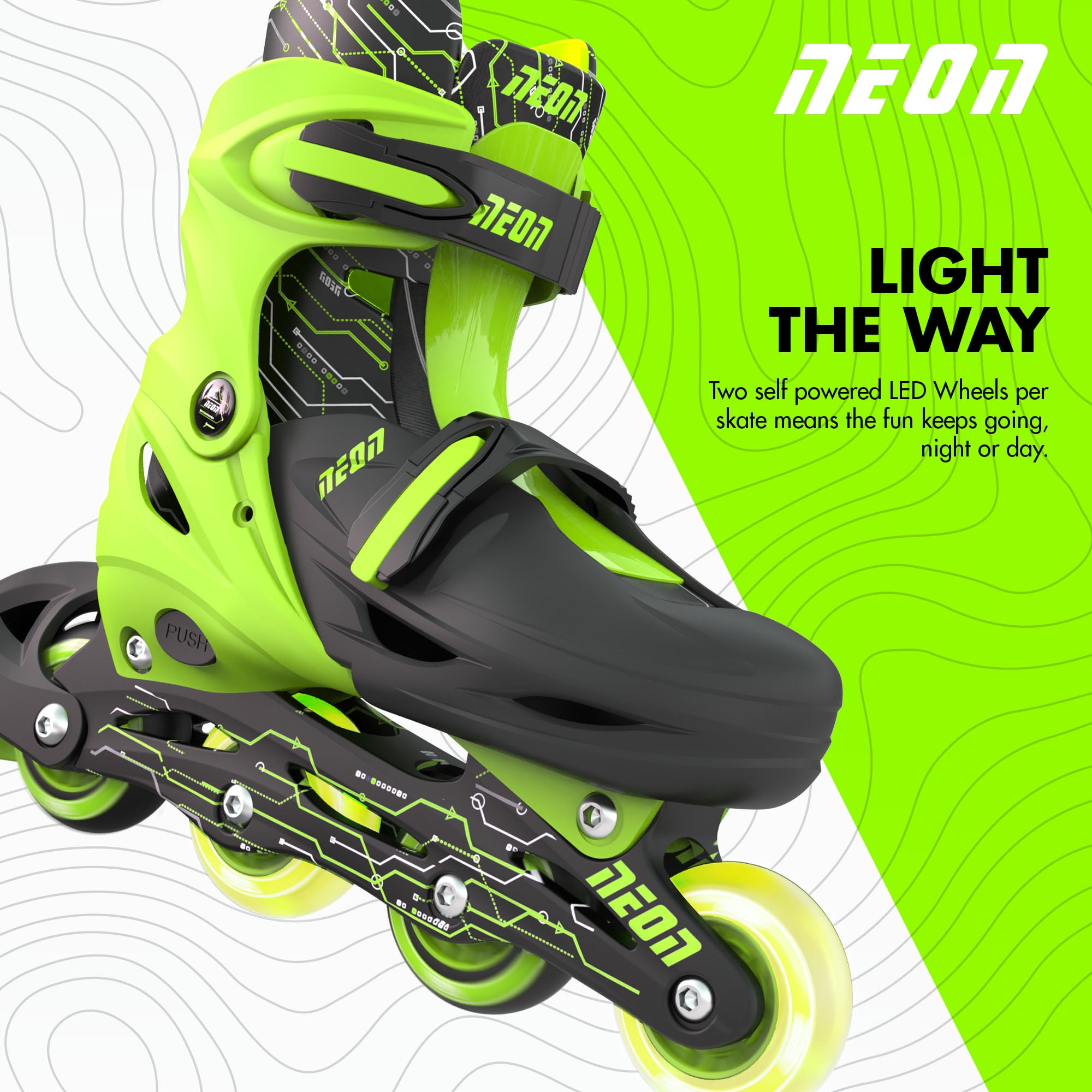 Enjoy the dazzling LED light-up wheels of our new NEON Inline Skates! Designed for skaters of all levels, from beginners to pros, these skates promise an epic ride. Say hello to illuminated fun that’s bound to brighten up any skating adventure. Our NEON Inline Skates feature adjustable sizing, making it effortless to find the perfect fit. With just a simple adjustment of the toe cap, you can customize the size to ensure maximum comfort and support. Plus, with durable polyurethane wheels, you can enjoy a smooth glide with reduced noise and shock absorption for a more enjoyable ride. Ready to hit the pavement? Our NEON Inline Skates are equipped with a plush inner boot liner for added comfort and a convenient easy-stop brake for safety. Designed for ages 5 and up, these skates are built to grow with your child, providing endless fun and excitement for years to come.