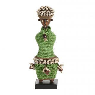 Original price was: $41.86.$34.74Current price is: $34.74.Add to cartThe Namji tribe are famous for these carved wooden decorative dolls used as both fertility dolls and play dolls for young girls who would name them, feed them, and carry them everywhere. Each doll is carved with unique features and facial expressions, making each truly one-of-a-kind. This small African namji doll is hand-carved from solid South African pine wood and adorned with natural cowrie shells around her head and waist, and green glass beads and kente cloth garb, a culturally significant silk and cotton fabric. Each a special work of art, these sacred dolls help prepare young girls for Namji womanhood and motherhood while being widely deemed some of the most beautiful dolls in Africa.